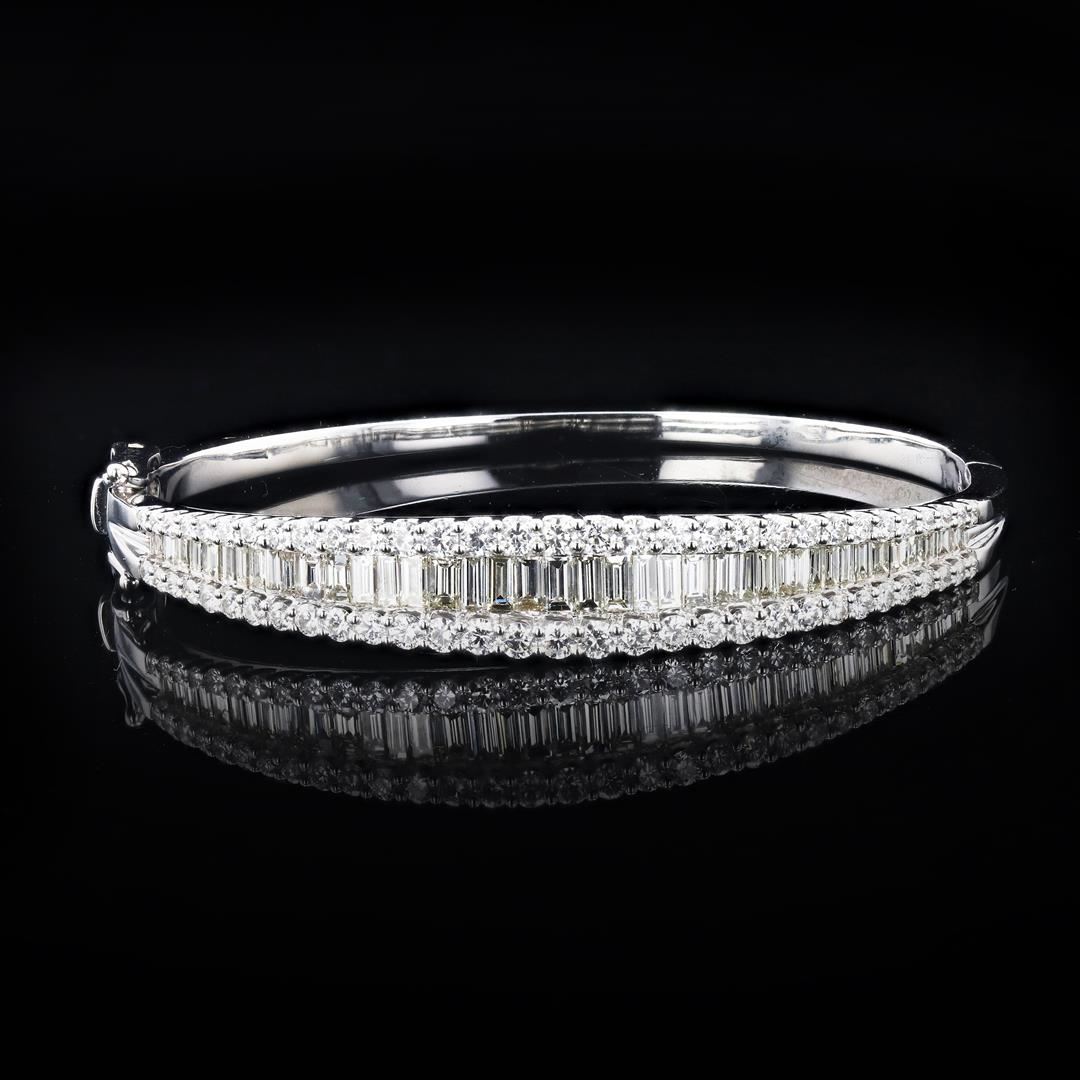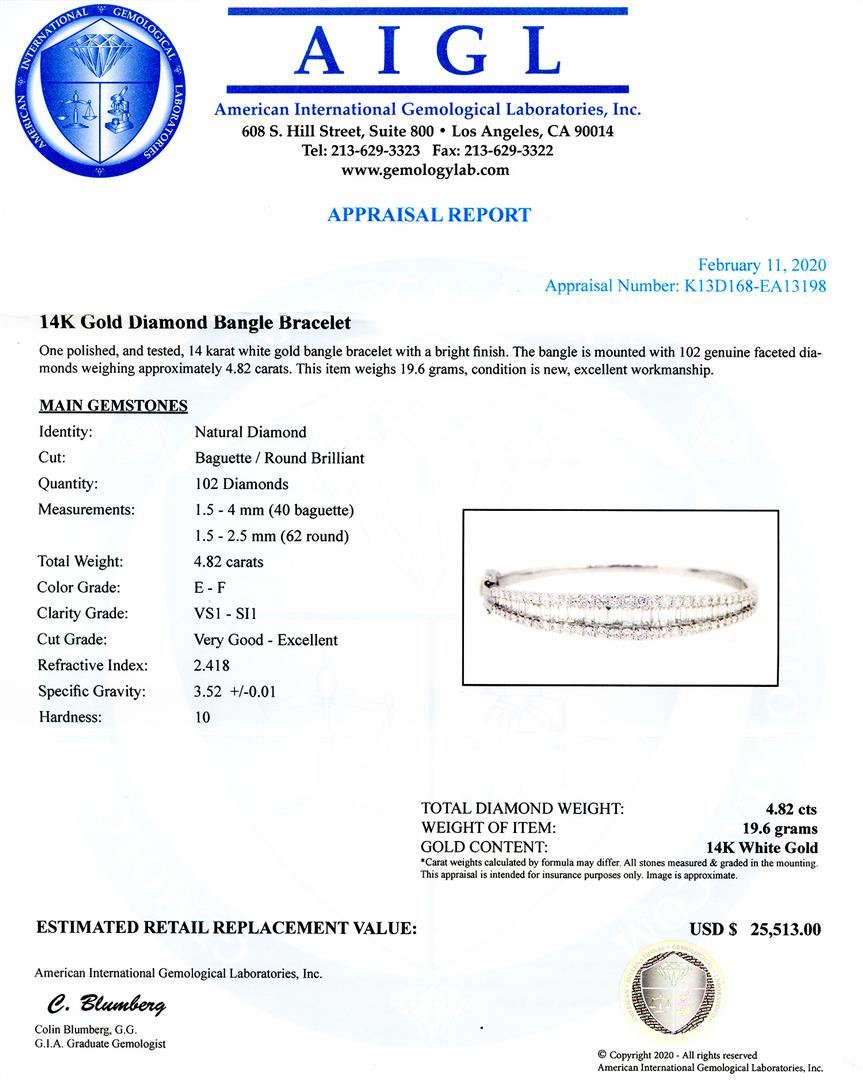 4.82ctw Diamond 14K White Gold Bangle Bracelet. Please see Photos and Description for all available information. This dazzling diamond bangle bracelet is the ultimate in luxury. The bracelet features 102 Baguette/round cut genuine diamonds set into 14K white gold.