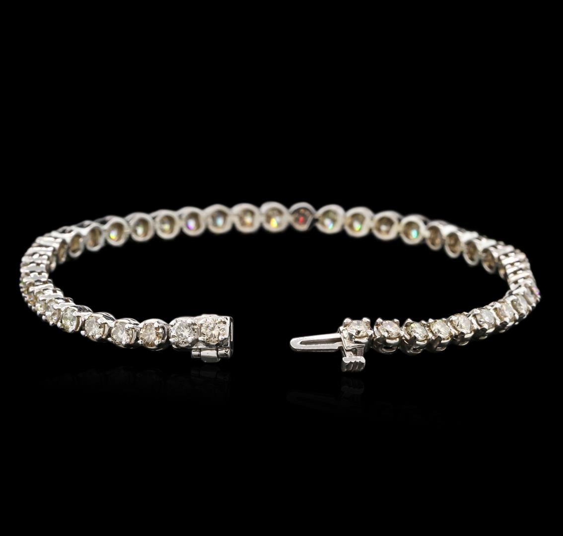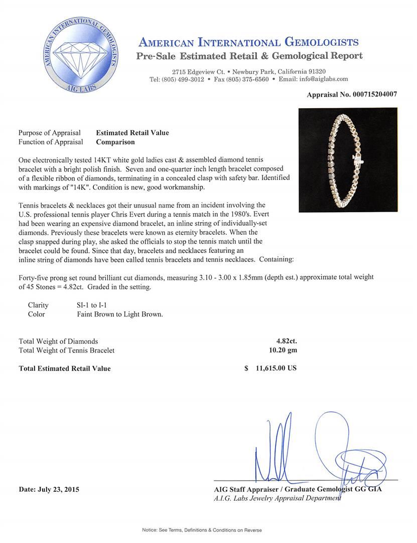 One electronically tested 14KT white gold ladies cast & assembled diamond tennis bracelet with a bright polish finish. Seven and one-quarter inch length bracelet composed of a flexible ribbon of diamonds, terminating in a concealed clasp with safety bar. Identified with markings of "14K". Condition is new, good workmanship. Tennis bracelets & necklaces got their unusual name from an incident involving the U.S. professional tennis player Chris Evert during a tennis match in the 1980's. Evert had been wearing an expensive diamond bracelet, an inline string of individually-set diamonds. Previously these bracelets were known as eternity bracelets. When the clasp snapped during play, she asked the officials to stop the tennis match until the bracelet could be found. Since that day, bracelets and necklaces featuring aninline string of diamonds have been called tennis bracelets and tennis necklaces. Containing: Forty-Five prong set round brilliant cut diamonds, measuring 3.10 - 3.00 x 1.85mm (depth est.) approximate. Total Weight of 45 Stones = 4.82ct. Graded in the setting. Clarity SI-1 to I-1. Color: Faint Brown to Light Brown. Total Weight of Diamonds 4.82ct. Total Weight of Tennis Bracelet 10.20gm. AIG Appraised at $11,615.00.