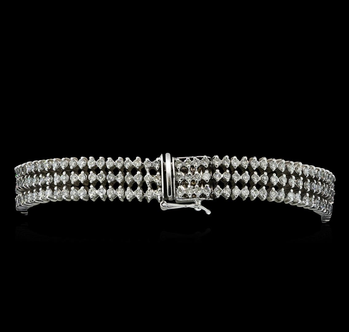 One electronically tested 14KT white gold ladies cast & assembled diamond bracelet. Seven inch length bracelet features a series of three flexible diamond ribbons, terminating in a concealed clasp with safety. Bright polish finish. Identified with markings of '14K'. Condition is good. Containing: Two Hundred Sixty-Four prong set round brilliant cut diamonds, measuring 1.70 - 1.70 x 1.02mm (depth est.) approximate total weight of 264 Stones = 4.83ct. Graded in the setting. Clarity SI-2 to I-2. Color: F - H. Total Weight of Diamonds 4.83ct.. Total Weight of Bracelet 27.12gm. AIG Appraised at $17,985.00.
