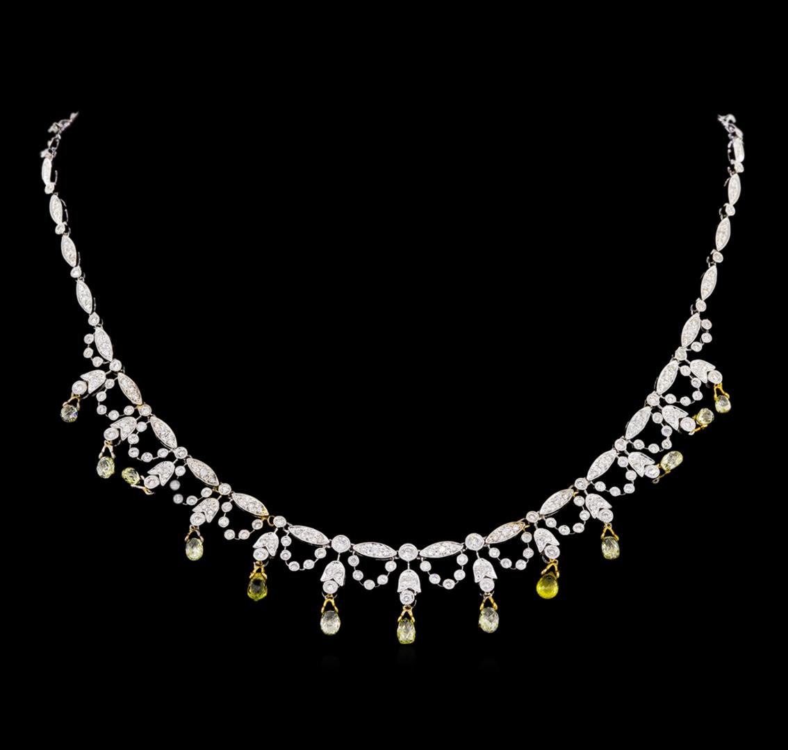 One electronically tested 18KT white gold ladies cast & assembled diamond and yellow sapphire necklace. Seventeen inch length necklace features an elaborate diamond set tuliped fringe with diamond and yellow sapphire briolette drops supported by a flexible diamond ribbon, terminating in a concealed clasp with safety. Bright polish finish with yellow gold accents and milgrain detailing. Identified with markings of "750". Condition is good. Containing: Three bezel set round brilliant cut diamonds, measuring 2.30 - 2.30 x 1.38mm (depth est.) approximate total weight of 3 Stones = 0.15ct. Graded in the setting. Clarity: SI-2 to I-1 . Color: G - H Two Hundred Sixty-Nine prong & bezel set round brilliant cut diamonds, measuring 1.50 - 1.20 x 0.81mm (depth est.) approximate total weight of 269 Stones = 2.52ct. Graded in the setting. Clarity: SI-2 to I-1 . Color: G - I Six briolette cut diamonds, measuring 5.00. x 3.00. x 2.50mm (depth est.) approximate total weight of 6 Stones = 1.56ct. Measurements & the color grade are an average for the group. Graded in the setting. Clarity: SI-2 to I-1 Five briolette cut diamonds, measuring 3.50 x 2.50 x 2.00.mm (depth est.) approximate total weight of 5 Stones = 0.60ct. Measurements & the color grade are an average for the group. Graded in the setting. Clarity: SI-2 to I-1 Two briolette cut natural yellow sapphires, measuring 5.50 x 3.50 x 3.00.mm, approximate total weight of 0.90ct., clarity is slightly included, type II, medium dark, moderately strong, yellow color, (GIA Y 6/4), cut is good. Transmitting light with a minimum of distortion, transparent. Naturally occurring internal & external characteristics are present. Measurements & the color grade are an average for the pair. Graded in the setting. Total Weight of Colored Stones 0.90ct.. Total Weight of Diamonds 4.83ct.. Total Weight of Necklace 23.23gm. AIG Appraised at $18,125.00.