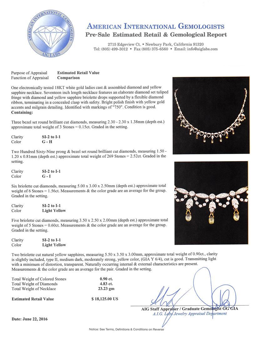 One electronically tested 18KT white gold ladies cast & assembled diamond and yellow sapphire necklace. Seventeen inch length necklace features an elaborate diamond set tuliped fringe with diamond and yellow sapphire briolette drops supported by a flexible diamond ribbon, terminating in a concealed clasp with safety. Bright polish finish with yellow gold accents and milgrain detailing. Identified with markings of "750". Condition is good. Containing: Three bezel set round brilliant cut diamonds, measuring 2.30 - 2.30 x 1.38mm (depth est.) approximate total weight of 3 Stones = 0.15ct. Graded in the setting. Clarity: SI-2 to I-1 . Color: G - H Two Hundred Sixty-Nine prong & bezel set round brilliant cut diamonds, measuring 1.50 - 1.20 x 0.81mm (depth est.) approximate total weight of 269 Stones = 2.52ct. Graded in the setting. Clarity: SI-2 to I-1 . Color: G - I Six briolette cut diamonds, measuring 5.00. x 3.00. x 2.50mm (depth est.) approximate total weight of 6 Stones = 1.56ct. Measurements & the color grade are an average for the group. Graded in the setting. Clarity: SI-2 to I-1 Five briolette cut diamonds, measuring 3.50 x 2.50 x 2.00.mm (depth est.) approximate total weight of 5 Stones = 0.60ct. Measurements & the color grade are an average for the group. Graded in the setting. Clarity: SI-2 to I-1 Two briolette cut natural yellow sapphires, measuring 5.50 x 3.50 x 3.00.mm, approximate total weight of 0.90ct., clarity is slightly included, type II, medium dark, moderately strong, yellow color, (GIA Y 6/4), cut is good. Transmitting light with a minimum of distortion, transparent. Naturally occurring internal & external characteristics are present. Measurements & the color grade are an average for the pair. Graded in the setting. Total Weight of Colored Stones 0.90ct.. Total Weight of Diamonds 4.83ct.. Total Weight of Necklace 23.23gm. AIG Appraised at $18,125.00.