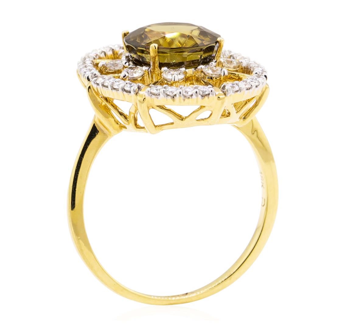 One electronically tested 18KT yellow gold lady's cast fashion ring with a starburst oval halo with a bright polish finish. The featured lady's ring has a shank measuring 1.35 millimeters wide. Identified with markings of '18K'. Condition is new, good workmanship. Containing: One prong set round modified mixed cut natural yellow zircon, measuring 8.87 - 8.75 x 5.42 mm, (depth est.) 5%. bulge factor, approximate weight of 4.33ct., clarity is eye clean, medium dark, brownish, orangy yellow color, (GIA oY 6/1), cut is good. Transmitting light with no distortion, transparent. Colored gemstones are presumed to have been subjected to commonly used enhancement processes. Graded in the setting. Eight prong set round brilliant cut diamonds, measuring 2.10 - 2.00 x 1.27mm (depth est.) approximate total weight of 8 Stones = 0.26ct. Graded in the setting. Color G - H Clarity VS-2 to SI-1 Cut Very Good Thirty-Two prong set round brilliant cut diamonds, measuring 1.35 - 1.30 x 0.80mm (depth est.) approximate total weight of 32 Stones = 0.26ct. Graded in the setting. Color G - H Clarity VS-2 to SI-1 Cut Very Good. Total Weight of Colored Stones 4.33ct.. Total Weight of Diamonds 0.52ct.. Total Weight of Ring 5.60gm GAS Appraised at $4255.00. GAS Appraised.