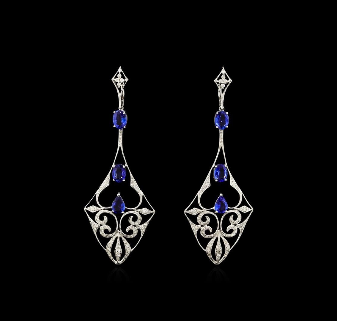 One pair electronically tested 18KT white gold lady's combination cast & assembled dangle earring with lever backs with a bright polish with milgrain detailing finish. The featured ladies' earrings are 75 millimeters in length. Trademark is MICHA. Identified with markings of "18K 750". Condition is new, good workmanship. Containing: Four prong set oval modified brilliant cut natural blue sapphires, measuring 7.05 x 5.02 x 2.80mm, approximate total weight of 3.35ct., clarity is slightly included, type II, medium, moderately strong, bluish violet color, (GIA bV 5/4), cut is good. Colored gemstones are presumed to have been subjected to commonly used enhancement processes. Graded in the setting. Two prong set pear modified brilliant cut natural blue sapphires, measuring 7.10 x 5.10 x 2.60mm, approximate total weight of 1.50ct., clarity is eye clean, type II, medium, moderately strong, bluish violet color, (GIA bV 5/4), cut is good. Colored gemstones are presumed to have been subjected to commonly used enhancement processes. Graded in the setting. One Hundred Forty-Four prong set round brilliant cut diamonds, measuring 1.50 - 1.00 x 0.75mm (depth est.) approximate total weight of 144 Stones = 1.02ct. Graded in the setting. Clarity: SI-2 to I-1. Color: H - I. Cut Good. Total Weight of Colored Stones 4.85ct. Total Weight of Diamonds 1.02ct. Total Weight of Earring 10.90gm. GAS Appraised at $9,260.00.
