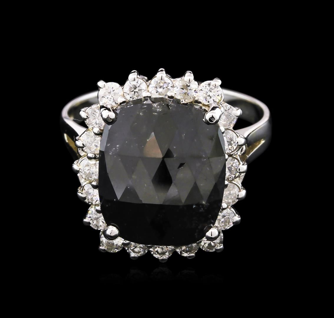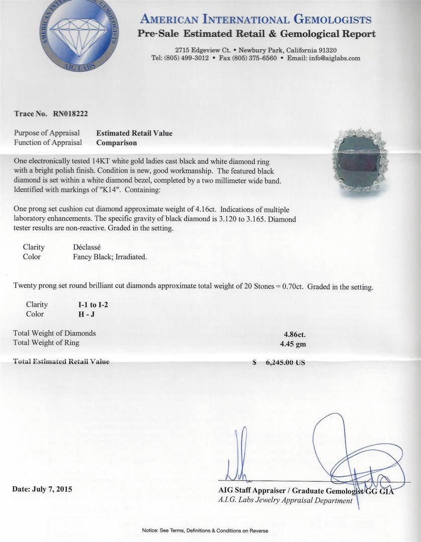 One electronically tested 14KT white gold ladies cast black and white diamond ring with a bright polish finish. Condition is new, good workmanship. The featured black diamond is set within a white diamond bezel, completed by a two millimeter wide band. Identified with markings of "K14". Containing: One prong set cushion cut diamond approximate weight of 4.16ct. Indications of multiple laboratory enhancements. The specific gravity of black diamond is3.120 to 3.165. Diamond tester results are non-reactive. Graded in the setting. Clarity: Declasse. Color: Fancy Black; Irradiated. Twenty prong set round brilliant cut diamonds approximate total weight of 20 Stones = 0.70ct. Graded in the setting. Clarity: I-1 to I-2.Color: H - J. AIG Appraised at $6,245.00.