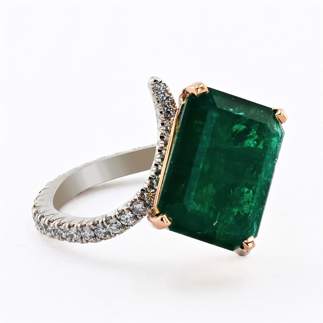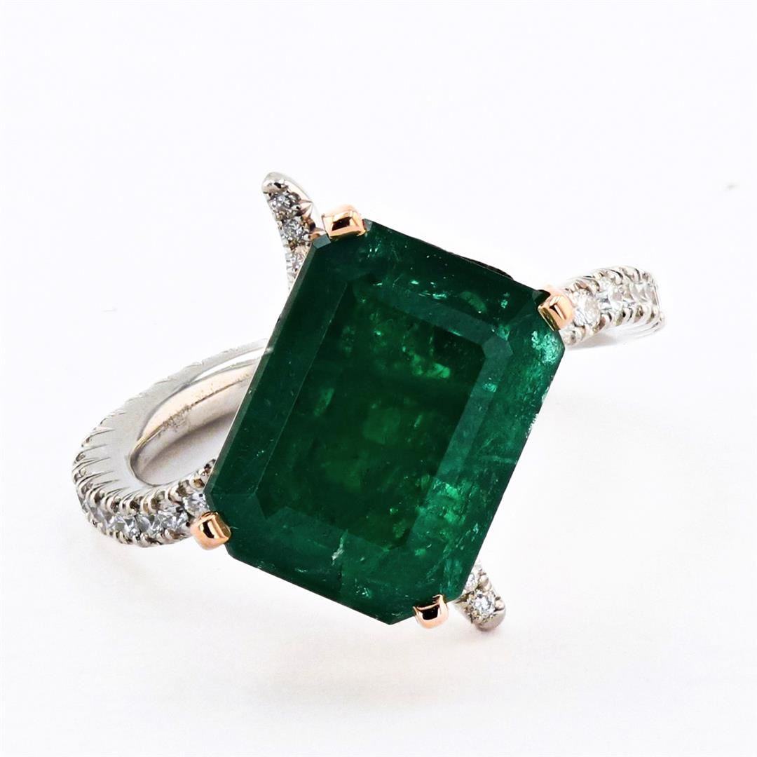 4.86ct Emerald and 0.74ctw Diamond 14K White and Yellow Gold Ring. Name of Article: Lady's Emerald and Diamond Ring Setting: 14 Kt. White Gold Mounting With Yellow gold Basket [5.60 gms] Additional Stones/Information: 54 Round Diamonds = Approx. 0.74 Cts. TWT (Color: F-G, Clarity: VS-SI) Ring Size: 5.75 Center Gemstone Information: SPECIES: Natural Beryl VARIETY: Emerald SHAPE AND CUT: Emerald Cut Weight: 4.86 Carat Measurements: 12.10 x 9.14 x 5.40mm COLOR HUE: Green SATURATION: Moderate TRANSPARENCY: Transparent