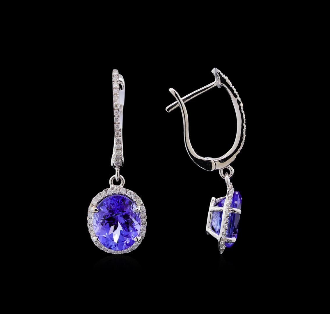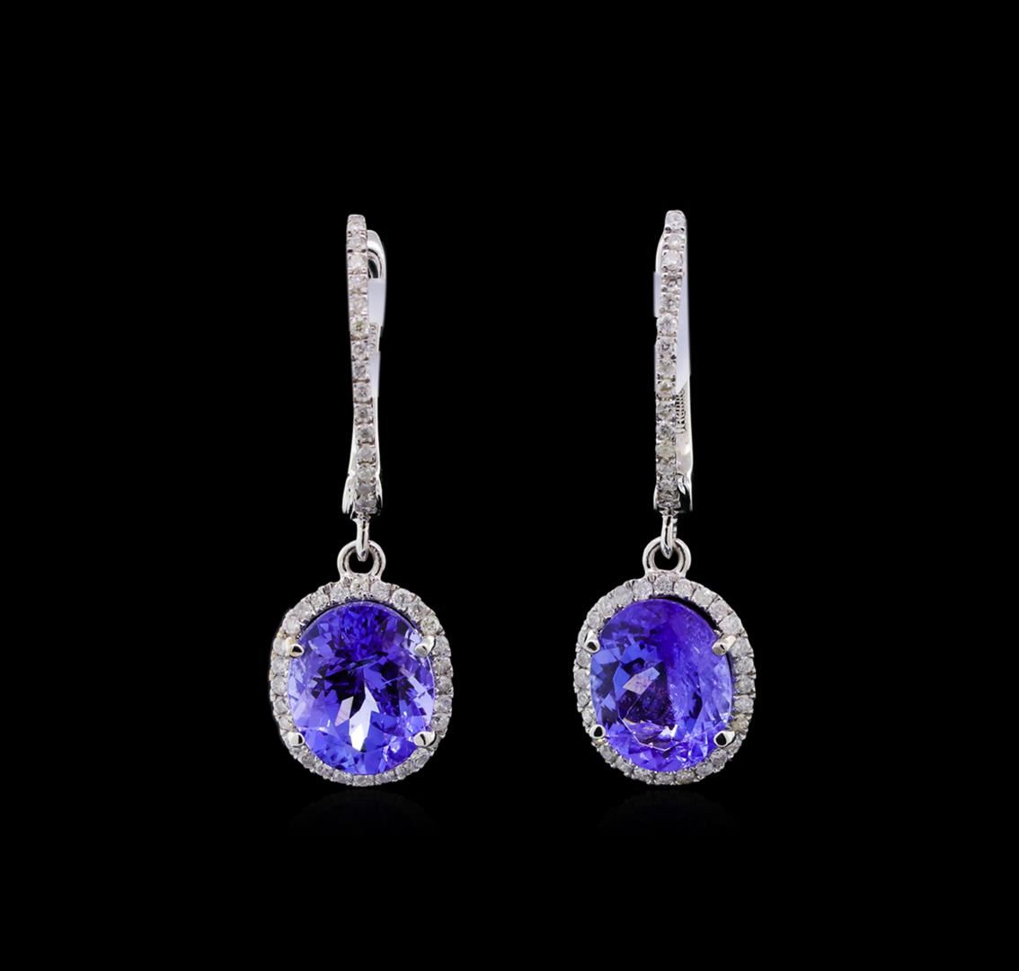 One pair electronically tested 14KT white gold cast & assembled tanzanite and diamond dangle earrings with hinged, snap locking posts. Each earring features a tanzanite and diamond bezel dangle, completed by a diamond set huggie. Bright polish finish. Trademark is Orianne. Identified with markings of "14K". Condition is new, good workmanship. Containing: Two prong set oval mixed cut natural tanzanites approximate total weight of 4.86ct., clarity is slightly included, type I, medium dark, very slightly grayish, violetish blue color, (GIA vB 6/3), cut is good. Transmitting light with a minimum of distortion, transparent. Naturally occurring internal & external characteristics are present. Color graded is an average for the pair. Graded in the setting. Tanzanite is a very rare gemstone that is only found in the country of Tanzania. Originally discovered in 1967. Tiffany & Company, named the stone Tanzanite. It is found in the Usumburu Mountains that border the Umba Valley of northern Tanzania. Tanzanite occurs in gray, brown, violet, blue, reddish-purple, & green. The gem is interesting because of its exceptional pleochroism. Rotated in different directions a tanzanite will exhibit multiple changes of color. Tanzanite has a low tolerance to ultrasonic cleaning, and should not be cleaned using this method. Eighty-Six prong set round brilliant cut diamonds approximate total weight of 86 Stones = 0.45ct. Graded in the setting. Clarity: I-1 to I-2. Color: G - I. Total Weight of Colored Stones 4.86ct. Total Weight of Diamonds 0.45ct. Total Weight of Earrings 3.46gm. AIG Appraised at $9,940.00.