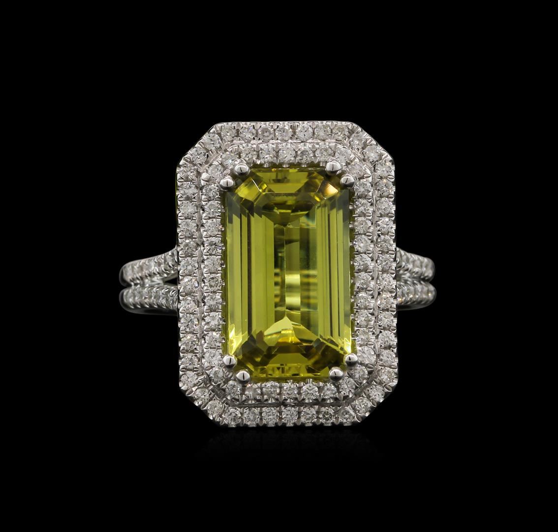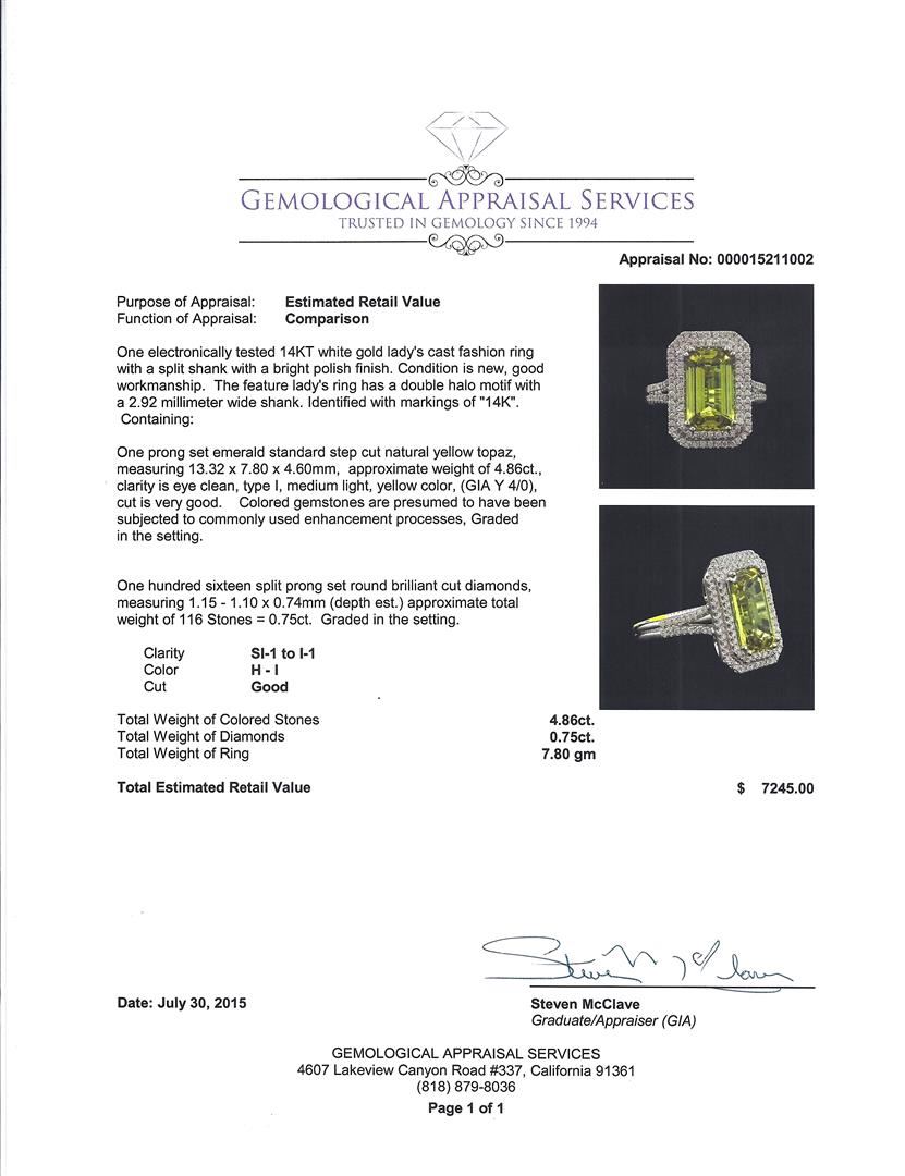One electronically tested 14KT white gold lady's cast fashion ring with a split shank with a bright polish finish. The feature lady's ring has a double halo motif with a 2.92 millimeter wide shank. Identified with markings of "14K". Condition is new, good workmanship. Containing: One prong set emerald standard step cut natural yellow topaz, measuring 13.32 x 7.80 x 4.60mm, approximate weight of 4.86ct., clarity is eye clean, type I, medium light, yellow color, (GIA Y 4/0), cut is very good. Colored gemstones are presumed to have been subjected to commonly used enhancement processes, Graded in the setting. One Hundred Sixteen split prong set round brilliant cut diamonds, measuring 1.15 - 1.10 x 0.74mm (depth est.) approximate. Total Weight of 116 Stones = 0.75ct. Graded in the setting. Clarity: SI-1 to I-1. Color: H - I. Cut Good. Total Weight of Colored Stones 4.86ct. Total Weight of Diamonds 0.75ct. Total Weight of Ring 7.80gm. GAS Appraised at $7,245.00.