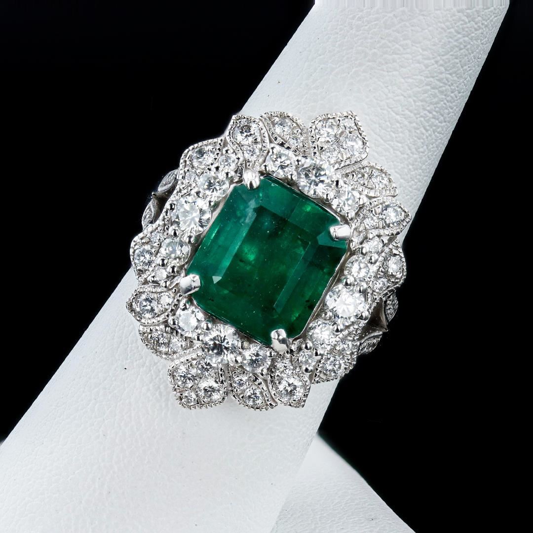 One polished, stamped, and tested platinum ring marked Oscar Friedman. The ring is mounted with: 1 genuine GIA certified emerald center stone weighing 4.87 carats, and 68 genuine round diamonds weighing approximately 1.44 carats. This item weighs 14.7 grams, condition is new, excellent workmanship. #MAIN GEMSTONE# GIA Report No.: 2225483822 Species: Natural Beryl Variety Emerald Shape: Octagonal Cutting Style: Step Cut Measurements: 10.36 x 9.48 x 6.66mm Weight: 4.87 carats Color: Green Transparency: Transparent Treatment Clarity Enhanced (F2) Refractive Index: 1.564 - 1.595 DR Birefringence: 0.005 to 0.009 Hardness: 7.5 - 8 #ADJACENT GEMSTONES ON RING# Identity: Natural Diamond Shape: Round Cutting Style: Brilliant Cut Quantity: 68 Diamonds Measurements: 1.0 - 3.0mm Total Weight: 1.44 carats Color Grade: G-H Clarity Grade: VVS2-SI2 Refractive Index: 2.417 Hardness: 10 EMERALD WEIGHT: 4.87 ct TOTAL DIAMOND WEIGHT: 1.44 cts WEIGHT OF ITEM: 14.7 grams METAL: Platinum Size: 7