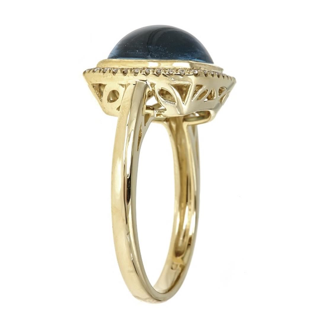 One Swiss Blue Topaz and Diamond Ring featuring: 10KT Yellow Gold with a total weight of 3.06 grams, Swiss Blue Topaz with a total weight of 4.87ct, and 40 Round Cut Diamonds with a total weight of 0.16ctw.