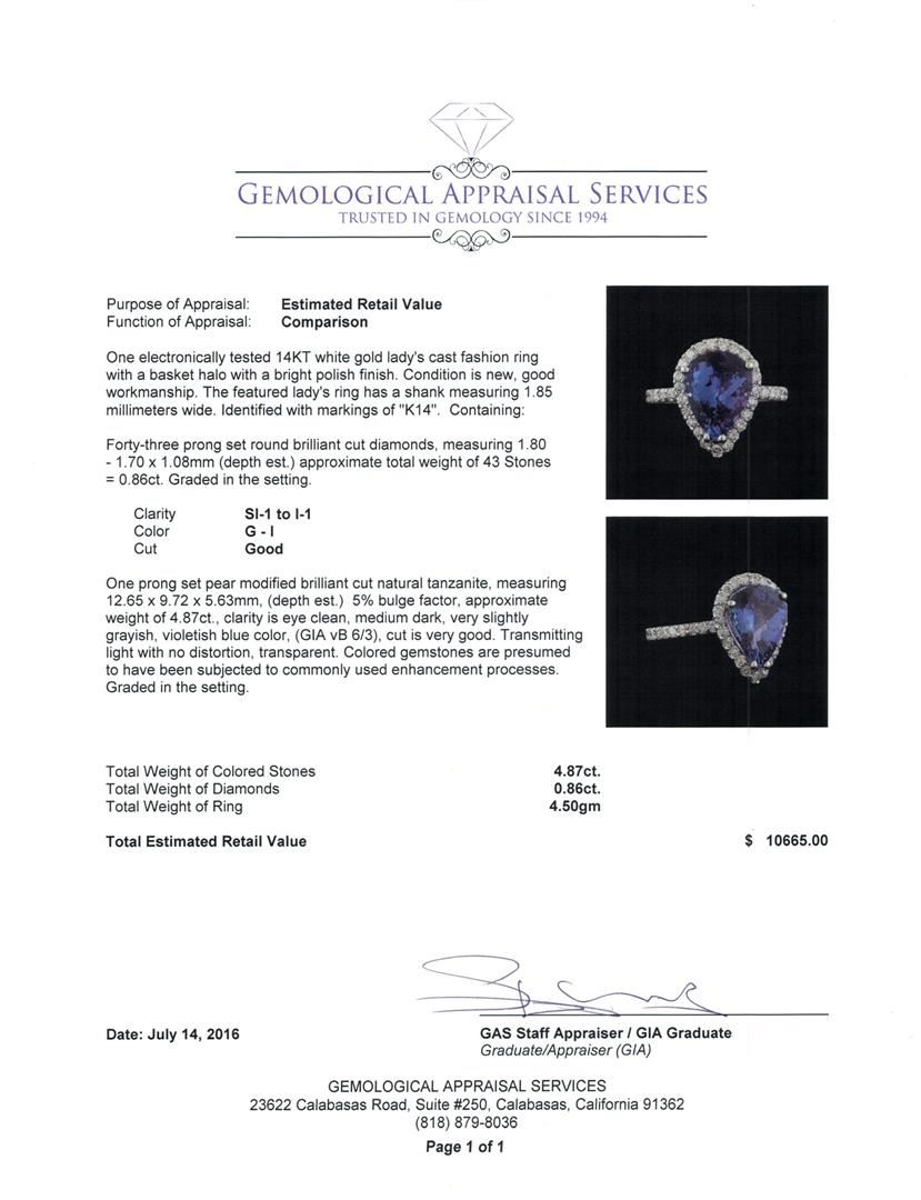 One electronically tested 14KT white gold lady's cast fashion ring with a basket halo with a bright polish finish. The featured lady's ring has a shank measuring 1.85 millimeters wide. Identified with markings of 'K14'. Condition is new, good workmanship. Containing: Forty-Three prong set round brilliant cut diamonds, measuring 1.80 - 1.70 x 1.08mm (depth est.) approximate total weight of 43 Stones = 0.86ct. Graded in the setting. Clarity SI-1 to I-1. Color: G - I Cut Good One prong set pear modified brilliant cut natural tanzanite, measuring 12.65 x 9.72 x 5.63mm, (depth est.) 5%. bulge factor, approximate weight of 4.87ct., clarity is eye clean, medium dark, very slightly grayish, violetish blue color, (GIA vB 6/3), cut is very good. Transmitting light with no distortion, transparent. Colored gemstones are presumed to have been subjected to commonly used enhancement processes. Graded in the setting. Total Weight of Colored Stones 4.87ct.. Total Weight of Diamonds 0.86ct.. Total Weight of Ring 4.50gm. GAS Appraised at $10,665.00.