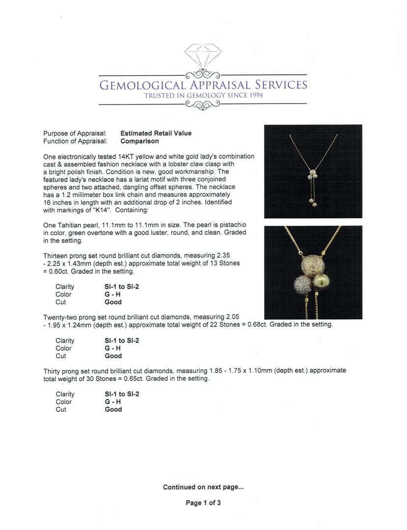 One electronically tested 14KT yellow and white gold lady's combination cast & assembled fashion necklace with a lobster claw clasp with a bright polish finish. The featured lady's necklace has a lariat motif with three conjoined spheres and two attached, dangling offset spheres. The necklace has a 1.2 millimeter box link chain and measures approximately 16 inches in length with an additional drop of 2 inches. Identified with markings of 'K14'. Condition is new, good workmanship. Containing: One Tahitian pearl, 11.1mm to 11.1mm in size. The pearl is pistachio in color, green overtone with a good luster, round, and clean. Graded in the setting. Thirteen prong set round brilliant cut diamonds, measuring 2.35 - 2.25 x 1.43mm (depth est.) approximate total weight of 13 Stones = 0.60ct. Graded in the setting. Clarity SI-1 to SI-2. Color: G - H Cut Good Twenty-Two prong set round brilliant cut diamonds, measuring 2.05 - 1.95 x 1.24mm (depth est.) approximate total weight of 22 Stones = 0.68ct. Graded in the setting. Clarity SI-1 to SI-2. Color: G - H Cut Good Thirty prong set round brilliant cut diamonds, measuring 1.85 - 1.75 x 1.10mm (depth est.) approximate total weight of 30 Stones = 0.65ct. Graded in the setting. Clarity SI-1 to SI-2. Color: G - H Cut Good Seventy-Two prong set round brilliant cut diamonds, measuring 1.65 - 1.55 x 0.96mm (depth est.) approximate total weight of 72 Stones = 1.08ct. Graded in the setting. Clarity SI-1 to SI-2. Color: G - H Cut Good One Hundred Sixty-Eight prong set round brilliant cut diamonds, measuring 1.40 - 1.35 x 0.86mm (depth est.) approximate total weight of 168 Stones = 1.68ct. Graded in the setting. Clarity SI-1 to SI-2. Color: G - H Cut Good Thirty prong set round brilliant cut diamonds, measuring 1.25 - 1.15 x 0.72mm (depth est.) approximate total weight of 30 Stones = 0.19ct. Graded in the setting. Clarity SI-1 to SI-2. Color: G - H Cut Good. Total Weight of Diamonds 4.88ct.. Total Weight of Necklace 17.80gm. GAS Appraised at $16,640.00.