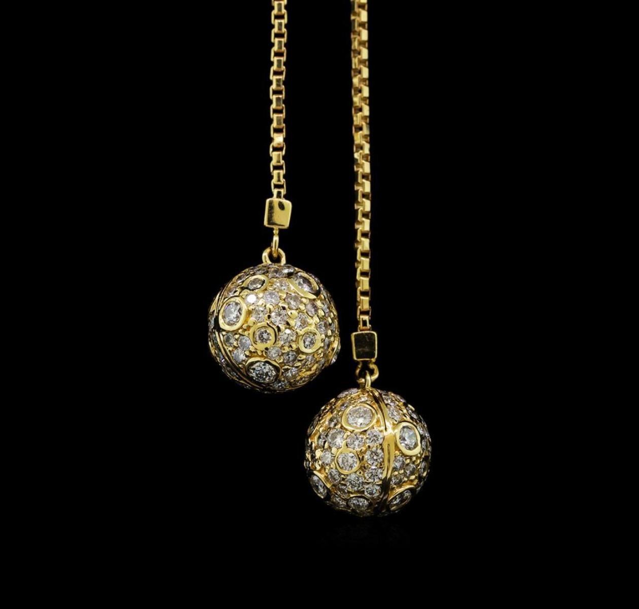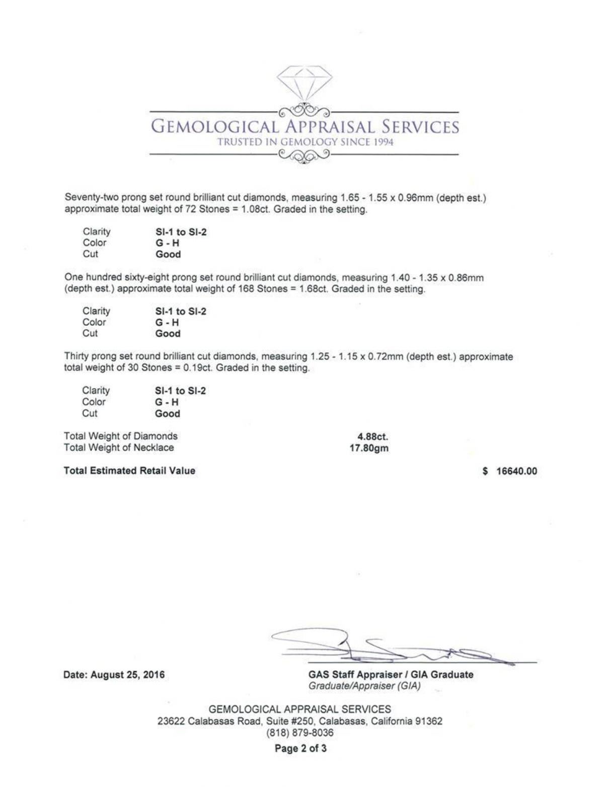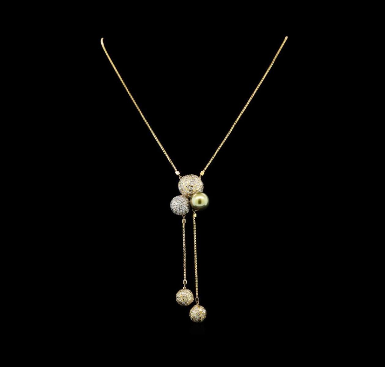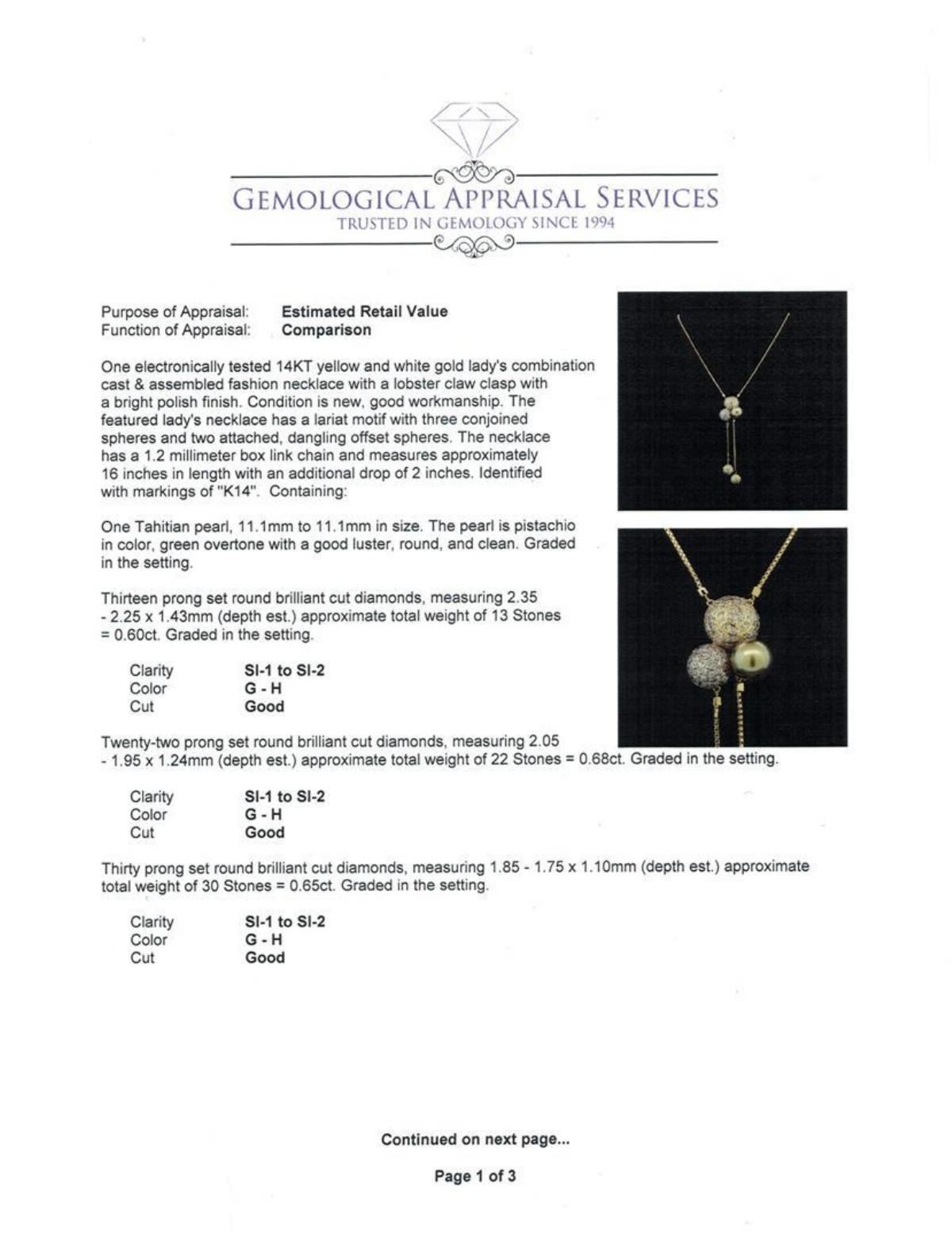 One electronically tested 14KT yellow and white gold lady's combination cast & assembled fashion necklace with a lobster claw clasp with a bright polish finish. The featured lady's necklace has a lariat motif with three conjoined spheres and two attached, dangling offset spheres. The necklace has a 1.2 millimeter box link chain and measures approximately 16 inches in length with an additional drop of 2 inches. Identified with markings of 'K14'. Condition is new, good workmanship. Containing: One Tahitian pearl, 11.1mm to 11.1mm in size. The pearl is pistachio in color, green overtone with a good luster, round, and clean. Graded in the setting. Thirteen prong set round brilliant cut diamonds, measuring 2.35 - 2.25 x 1.43mm (depth est.) approximate total weight of 13 Stones = 0.60ct. Graded in the setting. Clarity SI-1 to SI-2. Color: G - H Cut Good Twenty-Two prong set round brilliant cut diamonds, measuring 2.05 - 1.95 x 1.24mm (depth est.) approximate total weight of 22 Stones = 0.68ct. Graded in the setting. Clarity SI-1 to SI-2. Color: G - H Cut Good Thirty prong set round brilliant cut diamonds, measuring 1.85 - 1.75 x 1.10mm (depth est.) approximate total weight of 30 Stones = 0.65ct. Graded in the setting. Clarity SI-1 to SI-2. Color: G - H Cut Good Seventy-Two prong set round brilliant cut diamonds, measuring 1.65 - 1.55 x 0.96mm (depth est.) approximate total weight of 72 Stones = 1.08ct. Graded in the setting. Clarity SI-1 to SI-2. Color: G - H Cut Good One Hundred Sixty-Eight prong set round brilliant cut diamonds, measuring 1.40 - 1.35 x 0.86mm (depth est.) approximate total weight of 168 Stones = 1.68ct. Graded in the setting. Clarity SI-1 to SI-2. Color: G - H Cut Good Thirty prong set round brilliant cut diamonds, measuring 1.25 - 1.15 x 0.72mm (depth est.) approximate total weight of 30 Stones = 0.19ct. Graded in the setting. Clarity SI-1 to SI-2. Color: G - H Cut Good. Total Weight of Diamonds 4.88ct.. Total Weight of Necklace 17.80gm. GAS Appraised.