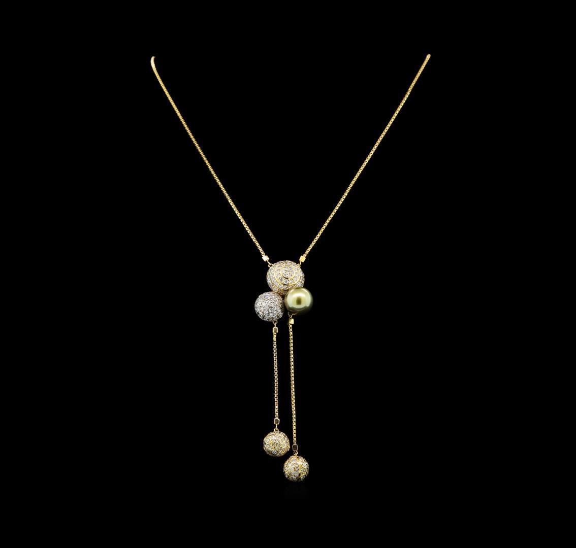 One electronically tested 14KT yellow and white gold lady's combination cast & assembled fashion necklace with a lobster claw clasp with a bright polish finish. The featured lady's necklace has a lariat motif with three conjoined spheres and two attached, dangling offset spheres. The necklace has a 1.2 millimeter box link chain and measures approximately 16 inches in length with an additional drop of 2 inches. Identified with markings of 'K14'. Condition is new, good workmanship. Containing: One Tahitian pearl, 11.1mm to 11.1mm in size. The pearl is pistachio in color, green overtone with a good luster, round, and clean. Graded in the setting. Thirteen prong set round brilliant cut diamonds, measuring 2.35 - 2.25 x 1.43mm (depth est.) approximate total weight of 13 Stones = 0.60 ct. Graded in the setting. Clarity SI-1 to SI-2. Color: G - H Cut Good Twenty-Two prong set round brilliant cut diamonds, measuring 2.05 - 1.95 x 1.24mm (depth est.) approximate total weight of 22 Stones = 0.68ct. Graded in the setting. Clarity SI-1 to SI-2. Color: G - H Cut Good Thirty prong set round brilliant cut diamonds, measuring 1.85 - 1.75 x 1.10mm (depth est.) approximate total weight of 30 Stones = 0.65ct. Graded in the setting. Clarity SI-1 to SI-2. Color: G - H Cut Good Seventy-Two prong set round brilliant cut diamonds, measuring 1.65 - 1.55 x 0.96mm (depth est.) approximate total weight of 72 Stones = 1.08ct. Graded in the setting. Clarity SI-1 to SI-2. Color: G - H Cut Good One Hundred Sixty-Eight prong set round brilliant cut diamonds, measuring 1.40 - 1.35 x 0.86mm (depth est.) approximate total weight of 168 Stones = 1.68ct. Graded in the setting. Clarity SI-1 to SI-2. Color: G - H Cut Good Thirty prong set round brilliant cut diamonds, measuring 1.25 - 1.15 x 0.72mm (depth est.) approximate total weight of 30 Stones = 0.19ct. Graded in the setting. Clarity SI-1 to SI-2. Color: G - H Cut Good. Total Weight of Diamonds 4.88ct.. Total Weight of Necklace 17.80gm. GAS Appraised.