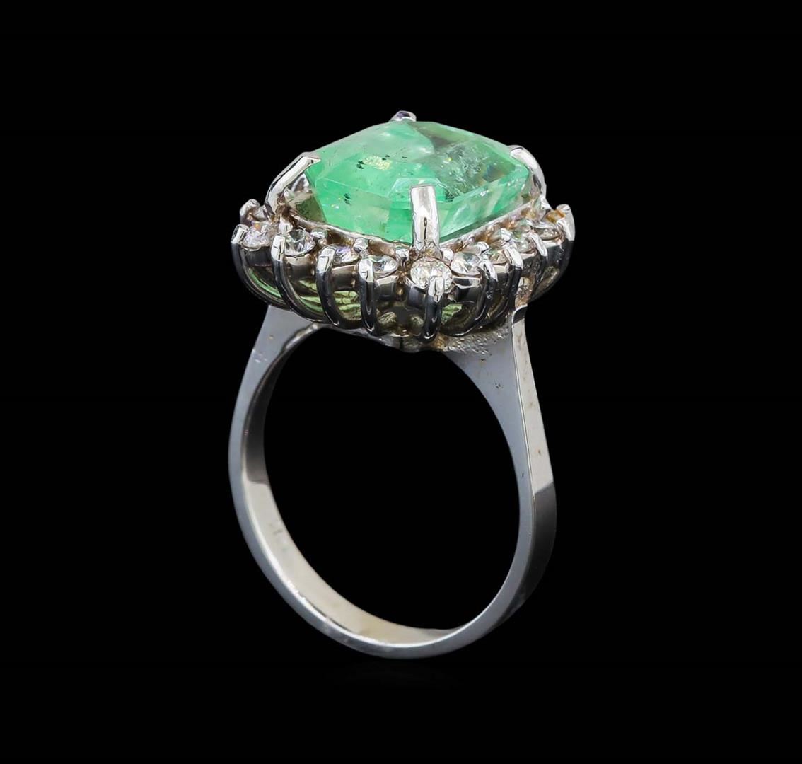 One electronically tested 14KT white gold lady's cast fashion ring with a basket halo with a bright polish finish. The featured lady's ring has a shank measuring 2.77 millimeters wide. Identified with markings of '14K'. Condition is new, good workmanship. Containing: One prong set emerald step cut natural emerald, measuring 11.55 x 9.01 x 6.56mm, (depth est.) approximate weight of 4.88ct., clarity is moderately included, medium light, moderately strong, green color, (GIA G 4/4), cut is good. Transmitting light somewhat diffusely, transparent to translucent. Naturally occurring internal & external characteristics are present. Indications of oil residue. Colored gemstones are presumed to have been subjected to commonly used enhancement processes. Graded in the setting. Eighteen prong set round brilliant cut diamonds, measuring 2.10 - 2.00 x 1.27mm (depth est.) approximate total weight of 18 Stones = 0.60ct. Graded in the setting. Clarity SI-1 to SI-2. Color: H - I Cut Good. Total Weight of Colored Stones 4.88ct.. Total Weight of Diamonds 0.60ct.. Total Weight of Ring 6.40gm. GAS Appraised at $9,195.00.
