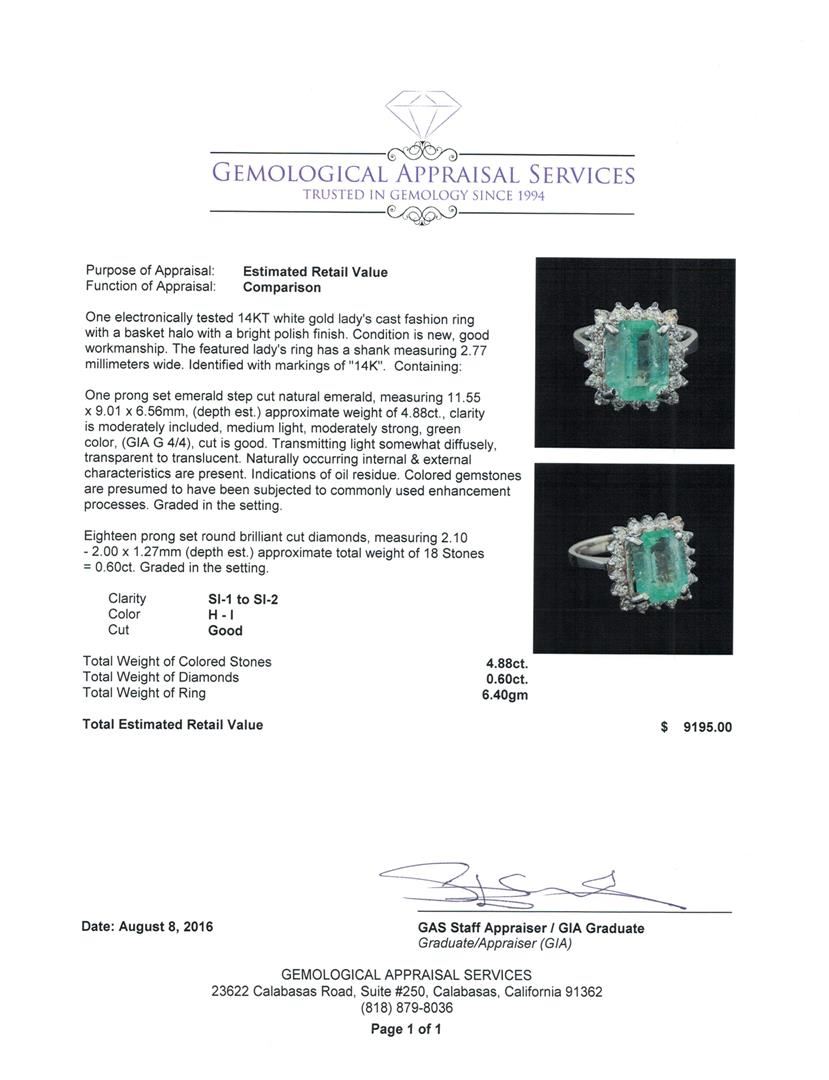 One electronically tested 14KT white gold lady's cast fashion ring with a basket halo with a bright polish finish. The featured lady's ring has a shank measuring 2.77 millimeters wide. Identified with markings of '14K'. Condition is new, good workmanship. Containing: One prong set emerald step cut natural emerald, measuring 11.55 x 9.01 x 6.56mm, (depth est.) approximate weight of 4.88ct., clarity is moderately included, medium light, moderately strong, green color, (GIA G 4/4), cut is good. Transmitting light somewhat diffusely, transparent to translucent. Naturally occurring internal & external characteristics are present. Indications of oil residue. Colored gemstones are presumed to have been subjected to commonly used enhancement processes. Graded in the setting. Eighteen prong set round brilliant cut diamonds, measuring 2.10 - 2.00 x 1.27mm (depth est.) approximate total weight of 18 Stones = 0.60ct. Graded in the setting. Clarity SI-1 to SI-2. Color: H - I Cut Good. Total Weight of Colored Stones 4.88ct.. Total Weight of Diamonds 0.60ct.. Total Weight of Ring 6.40gm. GAS Appraised at $9,195.00.