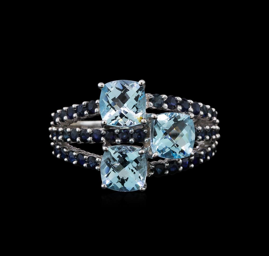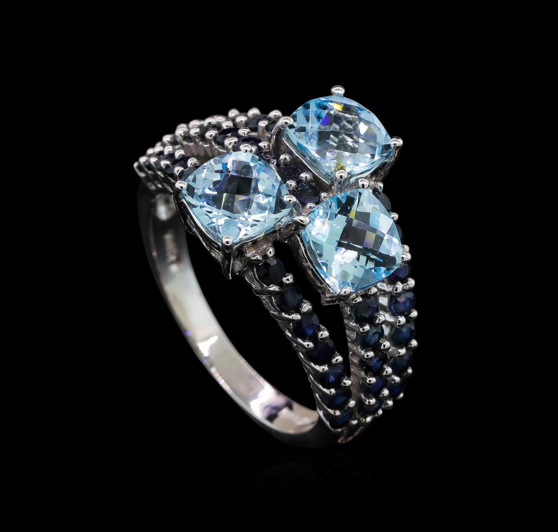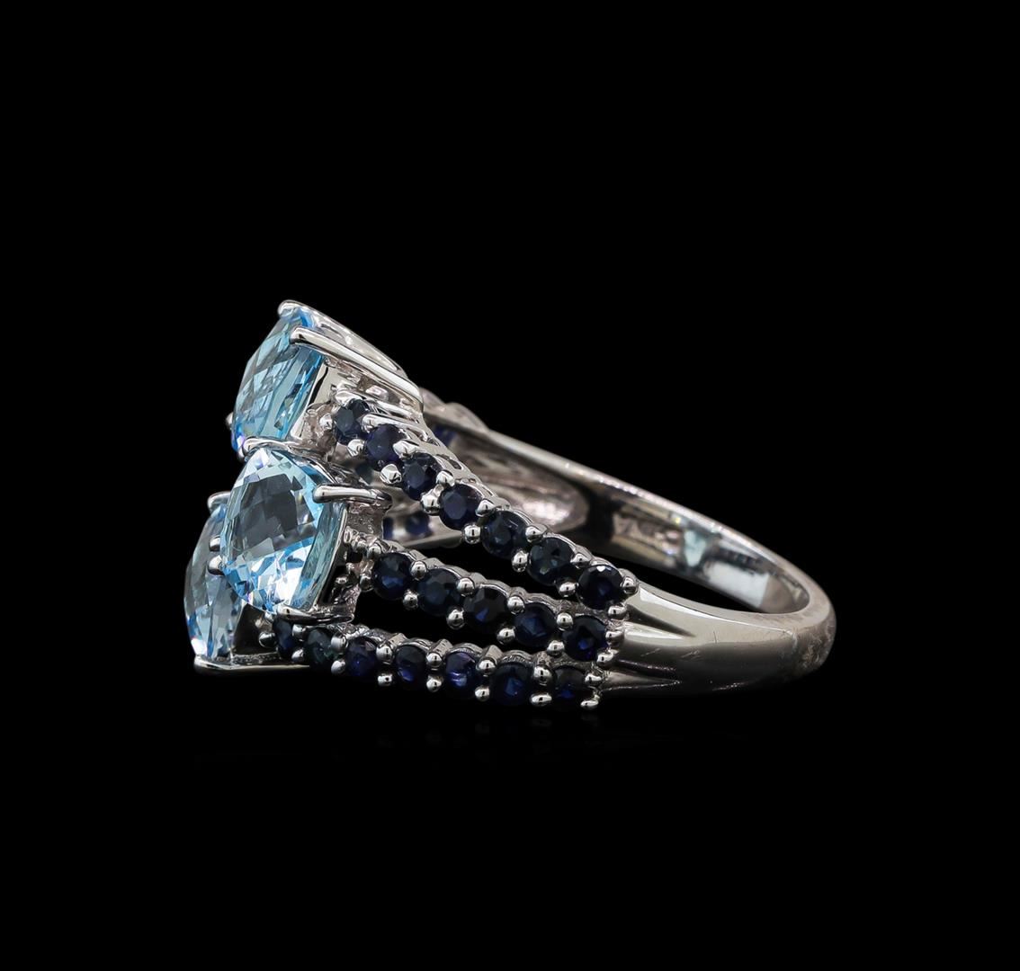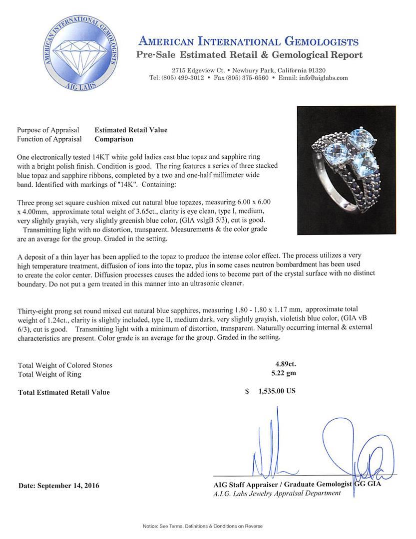 One electronically tested 14KT white gold ladies cast blue topaz and sapphire ring with a bright polish finish. The ring features a series of three stacked blue topaz and sapphire ribbons, completed by a two and one-half millimeter wide band. Identified with markings of '14K'. Condition is good. Containing: Three prong set square cushion mixed cut natural blue topazes, measuring 6.00 x 6.00 x 4.00mm, approximate total weight of 3.65ct., clarity is eye clean, type I, medium, very slightly grayish, very slightly greenish blue color, (GIA vslgB 5/3), cut is good. Transmitting light with no distortion, transparent. Measurements & the color grade are an average for the group. Graded in the setting. A deposit of a thin layer has been applied to the topaz to produce the intense color effect. The process utilizes a very high temperature treatment, diffusion of ions into the topaz, plus in some cases neutron bombardment has been used to create the color center. Diffusion processes causes the added ions to become part of the crystal surface with no distinct boundary. Do not put a gem treated in this manner into an ultrasonic cleaner. Thirty-eight prong set round mixed cut natural blue sapphires, measuring 1.80 - 1.80 x 1.17 mm, approximate total weight of 1.24ct., clarity is slightly included, type II, medium dark, very slightly grayish, violetish blue color, (GIA vB 6/3), cut is good. Transmitting light with a minimum of distortion, transparent. Naturally occurring internal & external characteristics are present. Color grade is an average for the group. Graded in the setting. Total Weight of Colored Stones 4.89ct.. Total Weight of Ring 5.22gm. AIG Appraised at $1,535.00.
