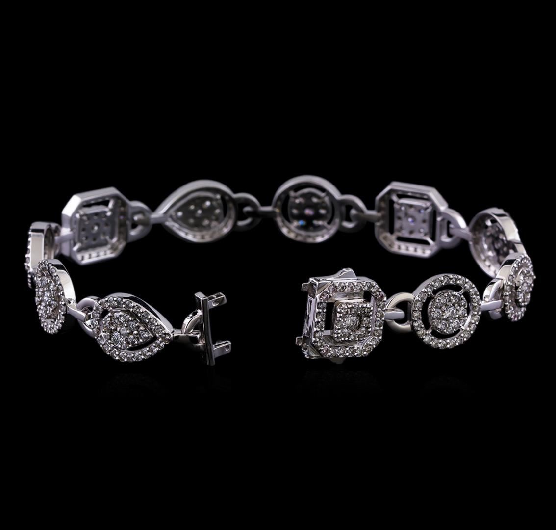 One electronically tested 14KT white gold lady's combination cast & assembled fashion straight line tennis bracelet with a tongue clasp with a bright polish finish. The featured lady's bracelet measure 7.25 inches in length. Identified with markings of "K14". Condition is new, good workmanship. Containing: Fifteen prong set round brilliant cut diamonds, measuring 2.40 - 2.35 x 1.48mm (depth est.) approximate total weight of 15 Stones = 0.76ct. Graded in the setting. Clarity: SI-1 to SI-2. Color: H - I. Cut Good Fifty-Six prong set round brilliant cut diamonds, measuring 1.70 - 1.60 x 1.02mm (depth est.) approximate total weight of 56 Stones = 0.95ct. Graded in the setting. Clarity: SI-1 to SI-2. Color: H - I. Cut Good Two Hundred Forty-Eight prong set round brilliant cut diamonds, measuring 1.40 - 1.30 x 0.84mm (depth est.) approximate total weight of 248 Stones = 2.50ct. Graded in the setting. Clarity: SI-1 to SI-2. Color: G - I. Cut Good Fifty-Two prong set round brilliant cut diamonds, measuring 1.50 - 1.45 x 0.92mm (depth est.) approximate total weight of 52 Stones = 0.68ct. Graded in the setting. Clarity: SI-1 to SI-2. Color: H - I. Cut Good. Total Weight of Diamonds 4.89ct. Total Weight of Straight Line Tennis Bracelet 18.10gm. GAS Appraised.