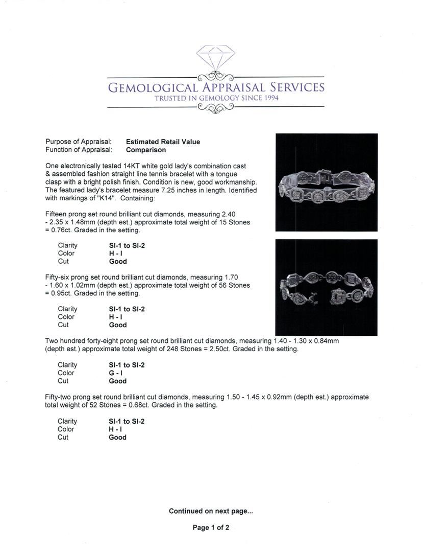 One electronically tested 14KT white gold lady's combination cast & assembled fashion straight line tennis bracelet with a tongue clasp with a bright polish finish. The featured lady's bracelet measure 7.25 inches in length. Identified with markings of "K14". Condition is new, good workmanship. Containing: Fifteen prong set round brilliant cut diamonds, measuring 2.40 - 2.35 x 1.48mm (depth est.) approximate total weight of 15 Stones = 0.76ct. Graded in the setting. Clarity: SI-1 to SI-2. Color: H - I. Cut Good Fifty-Six prong set round brilliant cut diamonds, measuring 1.70 - 1.60 x 1.02mm (depth est.) approximate total weight of 56 Stones = 0.95ct. Graded in the setting. Clarity: SI-1 to SI-2. Color: H - I. Cut Good Two Hundred Forty-Eight prong set round brilliant cut diamonds, measuring 1.40 - 1.30 x 0.84mm (depth est.) approximate total weight of 248 Stones = 2.50ct. Graded in the setting. Clarity: SI-1 to SI-2. Color: G - I. Cut Good Fifty-Two prong set round brilliant cut diamonds, measuring 1.50 - 1.45 x 0.92mm (depth est.) approximate total weight of 52 Stones = 0.68ct. Graded in the setting. Clarity: SI-1 to SI-2. Color: H - I. Cut Good. Total Weight of Diamonds 4.89ct. Total Weight of Straight Line Tennis Bracelet 18.10gm. GAS Appraised.
