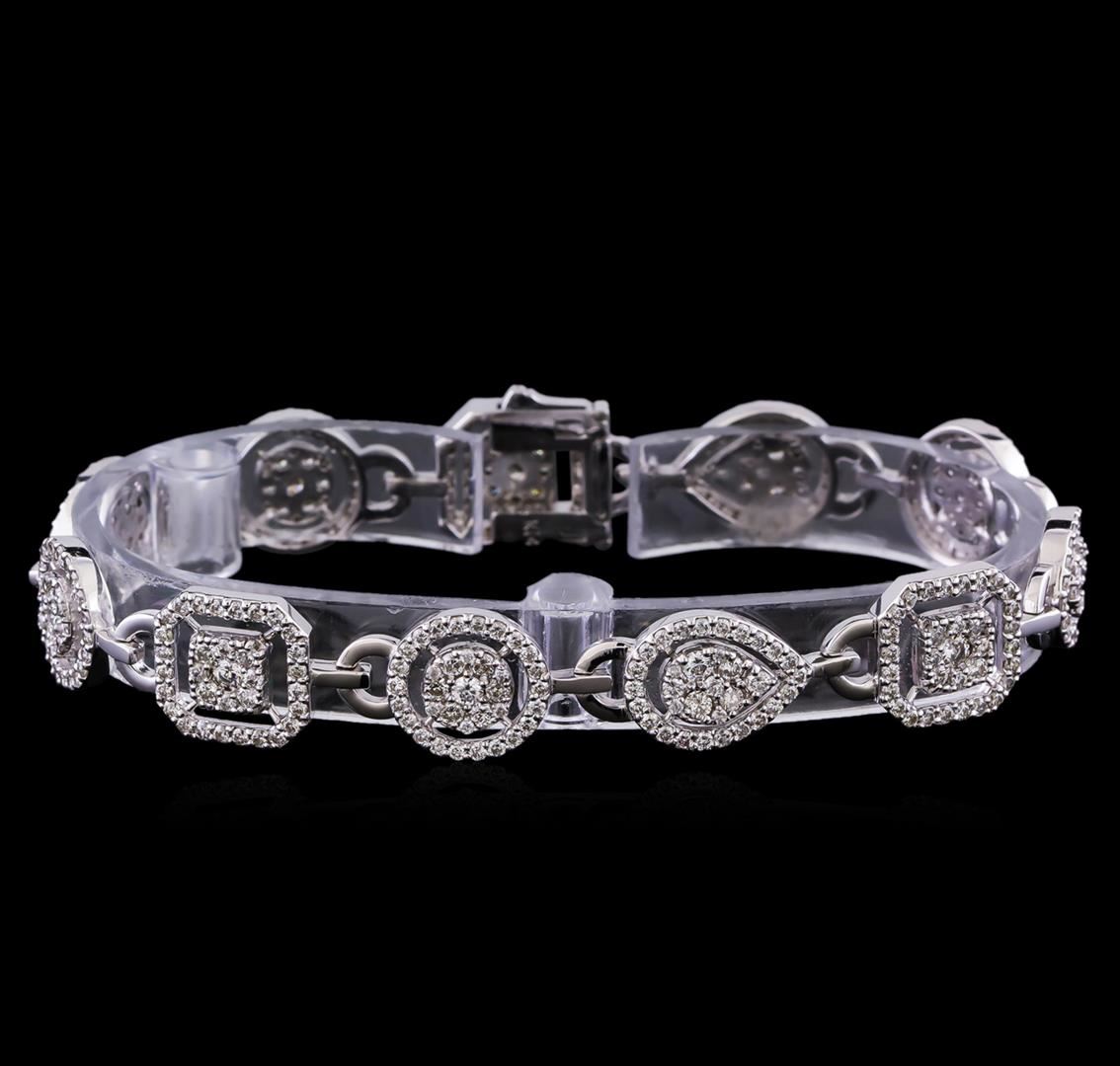 One electronically tested 14KT white gold lady's combination cast & assembled fashion straight line tennis bracelet with a tongue clasp with a bright polish finish. The featured lady's bracelet measure 7.25 inches in length. Identified with markings of "K14". Condition is new, good workmanship. Containing: Fifteen prong set round brilliant cut diamonds, measuring 2.40 - 2.35 x 1.48mm (depth est.) approximate total weight of 15 Stones = 0.76ct. Graded in the setting. Clarity: SI-1 to SI-2. Color: H - I. Cut Good Fifty-Six prong set round brilliant cut diamonds, measuring 1.70 - 1.60 x 1.02mm (depth est.) approximate total weight of 56 Stones = 0.95ct. Graded in the setting. Clarity: SI-1 to SI-2. Color: H - I. Cut Good Two Hundred Forty-Eight prong set round brilliant cut diamonds, measuring 1.40 - 1.30 x 0.84mm (depth est.) approximate total weight of 248 Stones = 2.50ct. Graded in the setting. Clarity: SI-1 to SI-2. Color: G - I. Cut Good Fifty-Two prong set round brilliant cut diamonds, measuring 1.50 - 1.45 x 0.92mm (depth est.) approximate total weight of 52 Stones = 0.68ct. Graded in the setting. Clarity: SI-1 to SI-2. Color: H - I. Cut Good. Total Weight of Diamonds 4.89ct. Total Weight of Straight Line Tennis Bracelet 18.10gm. GAS Appraised.