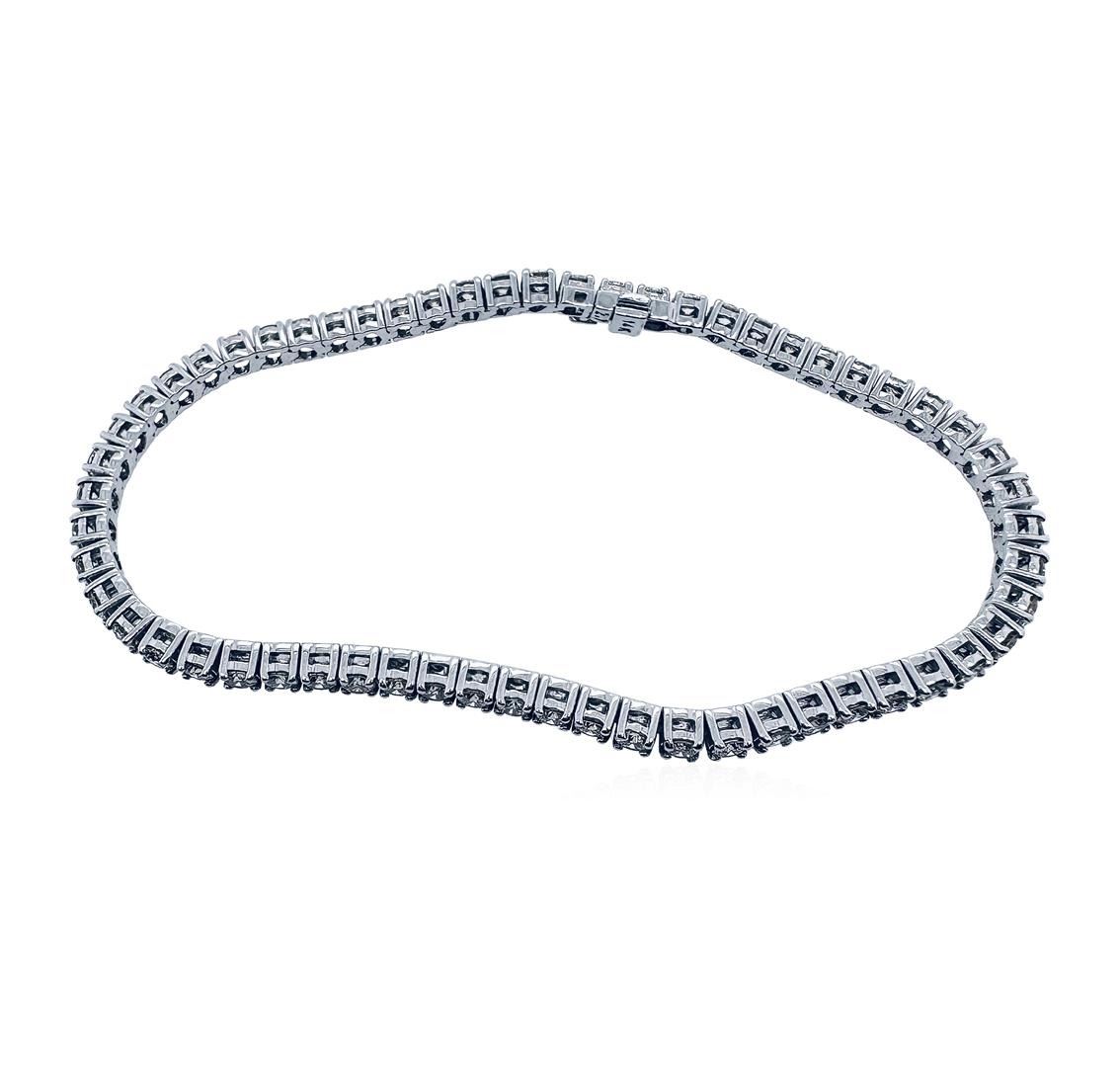 One electronically tested 14KT white gold lady's combination cast & assembled fashion straight line tennis bracelet with a tongue clasp with fold-under safety with a basket motif with a bright polish finish. Condition is new, good workmanship. The featured lady's bracelet measures approximately 7.00 inches in length. Identified with markings of 14K. Containing: 59 prong set round brilliant cut diamonds, measuring 2.80 - 2.70 x 1.71 mm (depth est), 5% GTCF approximate total weight of 59 stones = 4.89 ctw. Graded in the setting. Total weight of Diamonds: 4.89 ctw. Total weight of Tennis Bracelet 11.10gm. Total estimated retail value: $135200