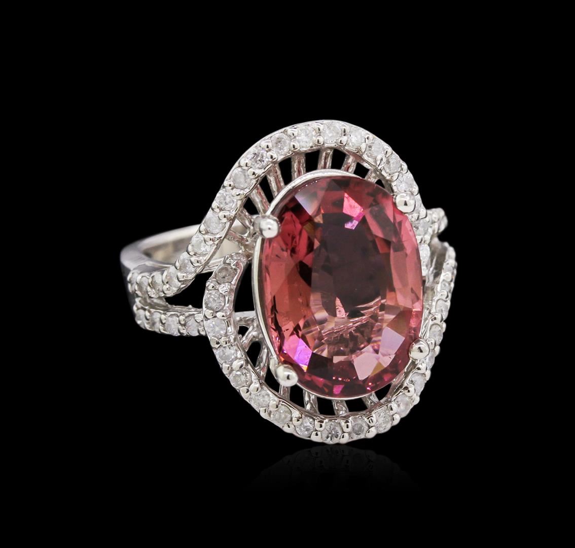 One 14KT white gold tourmaline and diamond ring. An oval cut tourmaline gemstone is prong mounted in the center of the ring. Round brilliant cut diamonds accent the ring around the center gemstone and on both sides. The ring is cast stamped "14K" and has a gross weight of 6.3 Grams. Diamond(s): Shape: Round Brilliant Cut. Weight: 0.45 carat. Average Clarity: I1. Average Color: H-J. Symmetry: Very Good. Polish: Very Good. GemStone(s): Tourmaline. Nature: Natural. Shape: Oval, Faceted. Quantity: 1, Mounted. Weight: 4.89 carat. Dimensions: Length - 12.93 mm. ; Width - 9.56 mm. Bulge: Visible. Clarity: SI, Type 2. Color: Pinkish Red (4/4). Symmetry: Very Good. Color Intensity: Medium. Transparency: Transparent. Tone: Medium. Metal(s): Metal: Gold, Stamped. Purity: 14K. Color: White. Condition: Excellent. Finish: High polish. GGA Appraised at $6,285.00.