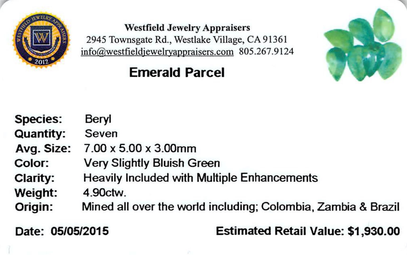 Seven pear mixed cut natural emeralds, measuring 7.00 x 5.00 x 3.00mm, exact total weight 4.90ct., clarity is heavily included, type III, medium, very slightly grayish, very slightly bluish green color, (GIA vslbG 5/3), cut is good. Indications of multiple laboratory enhancements, including high temperature heat treatment. Westfield Appraised at $1,930.00.