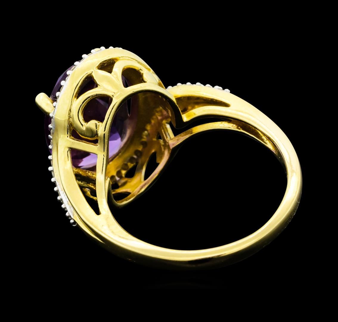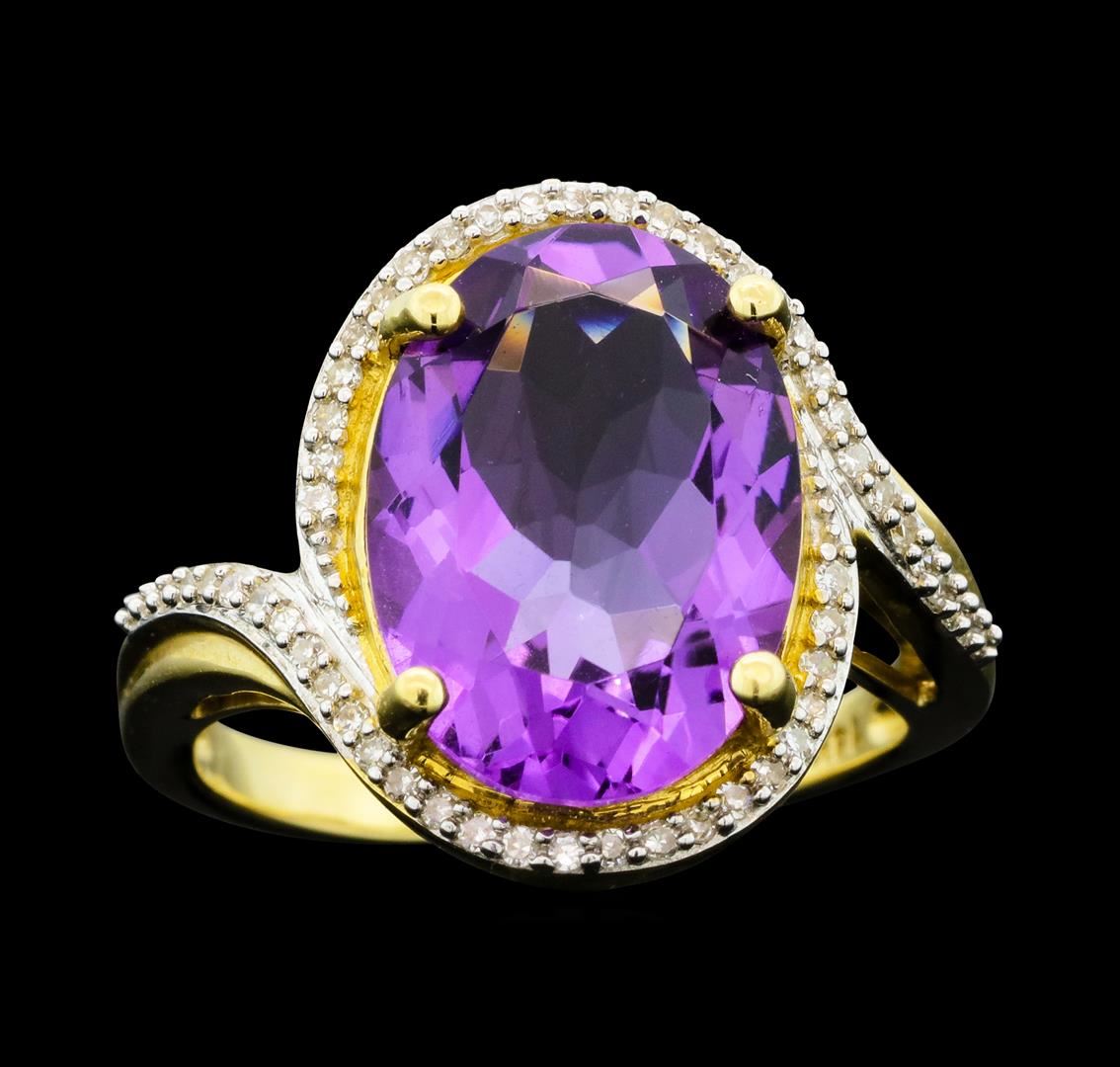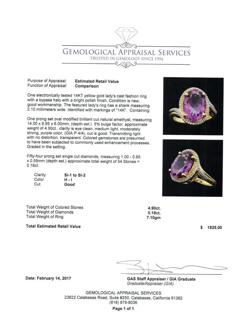 One electronically tested 14KT yellow gold lady's cast fashion ring with a bypass halo with a bright polish finish. The featured lady's ring has a shank measuring 2.10 millimeters wide. Identified with markings of '14K'. Condition is new, good workmanship. Containing: One prong set oval modified brilliant cut natural amethyst, measuring 14.00 x 9.95 x 6.00mm, (depth est.) 5%. bulge factor, approximate weight of 4.90 ct., clarity is eye clean, medium light, moderately strong, purple color, (GIA P 4/4), cut is good. Transmitting light with no distortion, transparent. Colored gemstones are presumed to have been subjected to commonly used enhancement processes. Graded in the setting. Fifty-Four prong set single cut diamonds, measuring 1.00 - 0.95 x 0.59mm (depth est.) approximate total weight of 54 Stones = 0.18ct. Clarity SI-1 to SI-2. Color: H - I Cut Good. Total Weight of Colored Stones 4.90 ct.. Total Weight of Diamonds 0.18ct.. Total Weight of Ring 7.10gm. GAS Appraised.