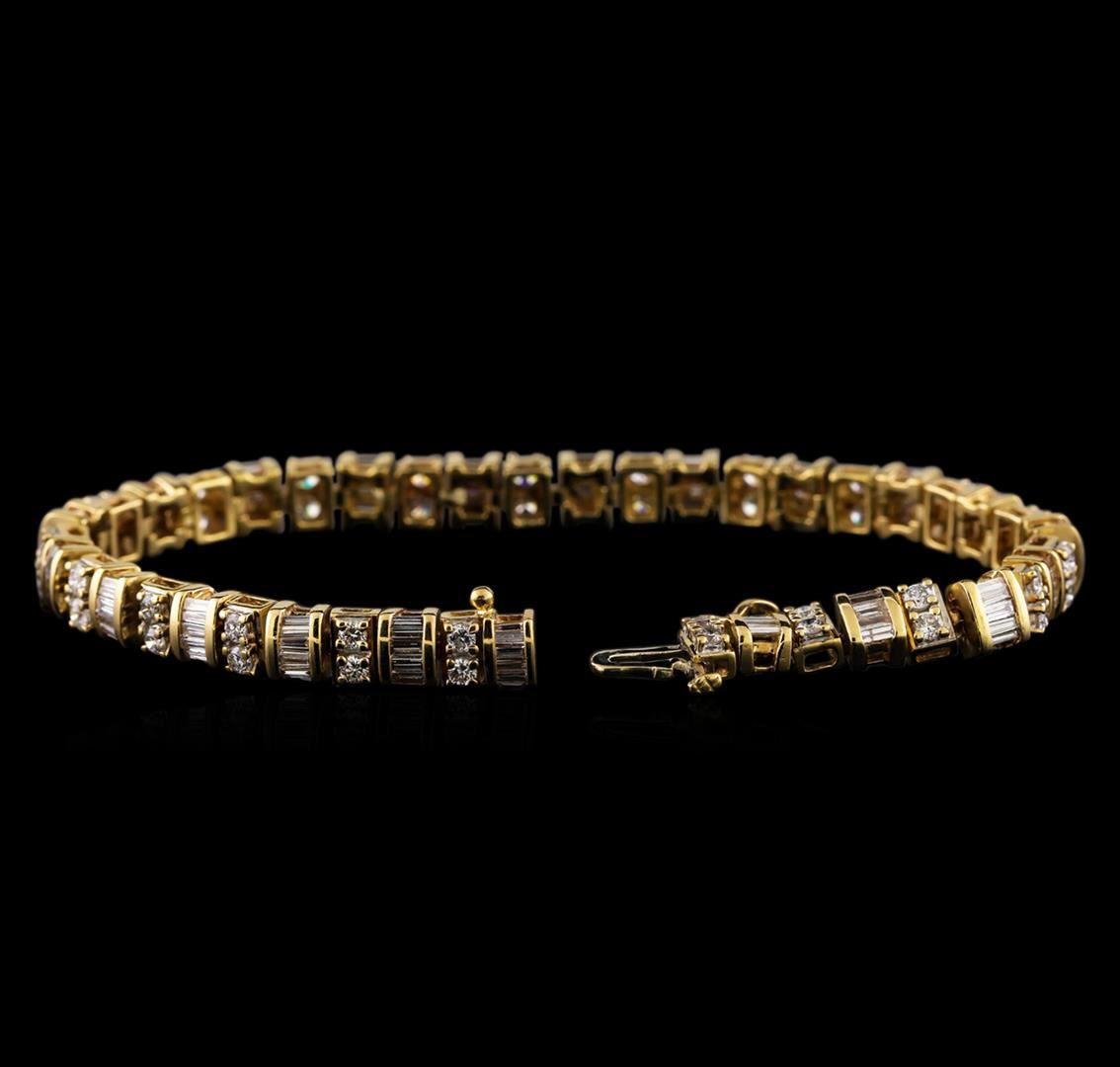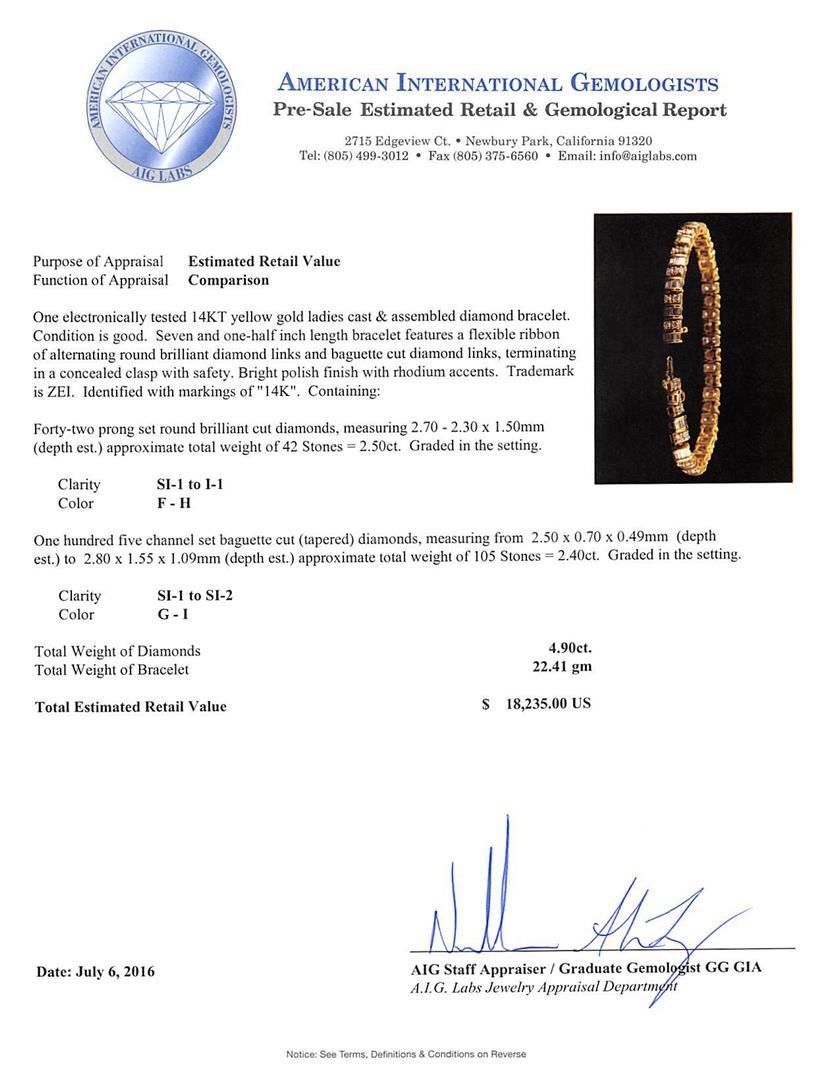 One electronically tested 14KT yellow gold ladies cast & assembled diamond bracelet. Seven and one-half inch length bracelet features a flexible ribbon of alternating round brilliant diamond links and baguette cut diamond links, terminating in a concealed clasp with safety. Bright polish finish with rhodium accents. Trademark is ZEI. Identified with markings of "14K". Condition is good. Containing: Forty-Two prong set round brilliant cut diamonds, measuring 2.70 - 2.30 x 1.50mm (depth est.) approximate total weight of 42 Stones = 2.50ct. Graded in the setting. Clarity: SI-1 to I-1. Color: F - H One Hundred Five channel set baguette cut (tapered) diamonds, measuring from 2.50 x 0.70 x 0.49mm (depth est.) to 2.80 x 1.55 x 1.09mm (depth est.) approximate total weight of 105 Stones = 2.40ct. Graded in the setting. Clarity: SI-1 to SI-2. Color: G - I. Total Weight of Diamonds 4.90ct. Total Weight of Bracelet 22.41gm. AIG Appraised at $18,235.00.