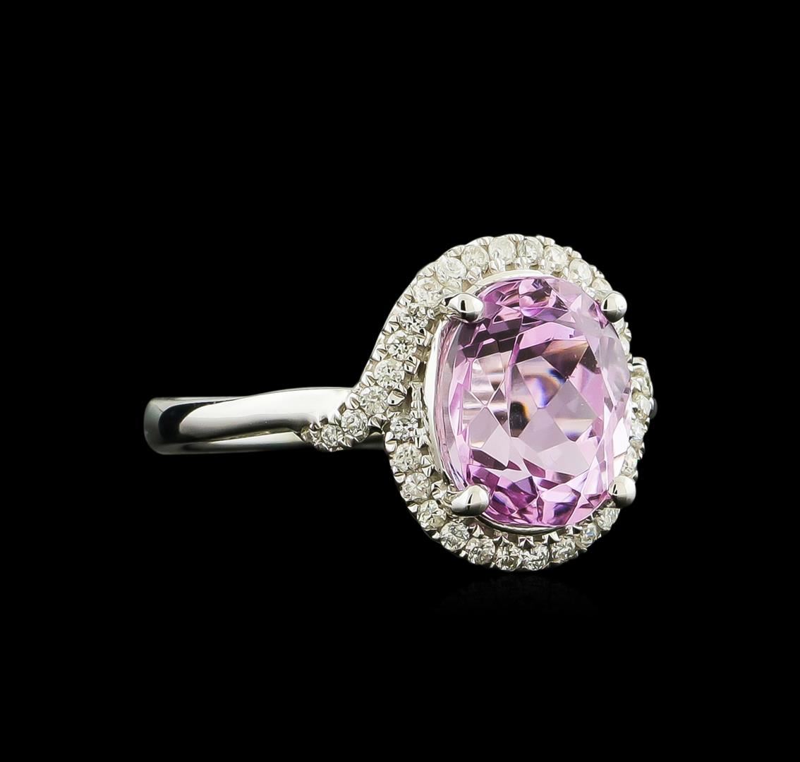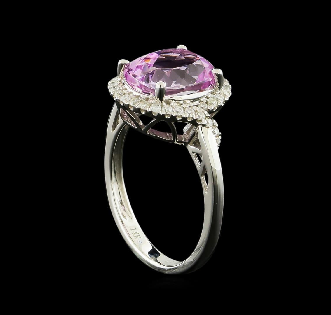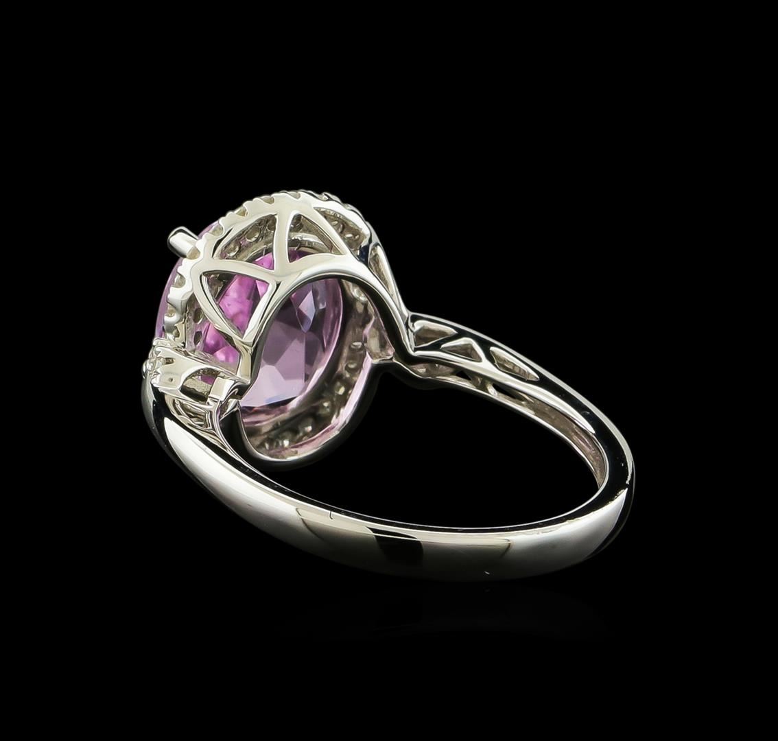 One electronically tested 14KT white gold lady's cast fashion ring with a bypass halo with a bright polish finish. The featured lady's ring has a shank measuring 2.51 millimeters wide. Identified with markings of "14K". Condition is new, good workmanship. Containing: One prong set oval modified brilliant cut natural kunzite, measuring 10.70 x 8.94 x 6.87mm, 11%. bulge factor, approximate weight of 4.90ct., clarity is eye clean, type I, light, moderately strong, reddish purple color, (GIA rP 3/4), cut is good. Transmitting light with no distortion, transparent. Colored gemstones are presumed to have been subjected to commonly used enhancement processes. Graded in the setting. Thirty-Six prong set round brilliant cut diamonds, measuring 1.35 - 1.25 x 0.81mm (depth est.) approximate total weight of 36 Stones = 0.30ct. Graded in the setting. Clarity: SI-1 to I-1. Color: G - Good. Total Weight of Colored Stones 4.90ct. Total Weight of Diamonds 0.30ct. Total Weight of Ring 4.80gm GAS Appraised at $3,605.00.