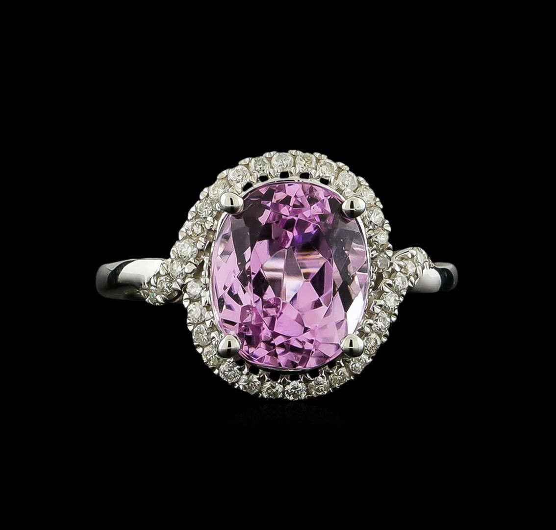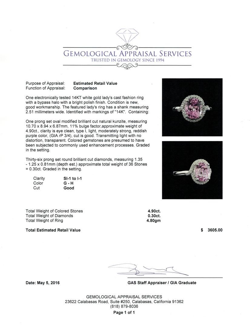 One electronically tested 14KT white gold lady's cast fashion ring with a bypass halo with a bright polish finish. The featured lady's ring has a shank measuring 2.51 millimeters wide. Identified with markings of "14K". Condition is new, good workmanship. Containing: One prong set oval modified brilliant cut natural kunzite, measuring 10.70 x 8.94 x 6.87mm, 11%. bulge factor, approximate weight of 4.90ct., clarity is eye clean, type I, light, moderately strong, reddish purple color, (GIA rP 3/4), cut is good. Transmitting light with no distortion, transparent. Colored gemstones are presumed to have been subjected to commonly used enhancement processes. Graded in the setting. Thirty-Six prong set round brilliant cut diamonds, measuring 1.35 - 1.25 x 0.81mm (depth est.) approximate total weight of 36 Stones = 0.30ct. Graded in the setting. Clarity: SI-1 to I-1. Color: G - Good. Total Weight of Colored Stones 4.90ct. Total Weight of Diamonds 0.30ct. Total Weight of Ring 4.80gm GAS Appraised at $3,605.00.