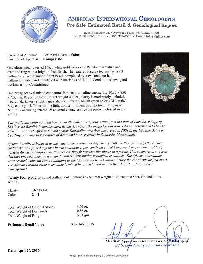 One electronically tested 14KT white gold ladies cast Paraiba tourmaline and diamond ring with a bright polish finish. The featured Paraiba tourmaline is set within a stylized diamond floret bezel, completed by a two and one-half millimeter wide band. Identified with markings of "K14". Condition is new, good workmanship. Containing: One prong set oval mixed cut natural Paraiba tourmaline, measuring 10.85 x 8.95 x 7.05mm, 8%. bulge factor, exact weight 4.90ct., clarity is moderately included, medium dark, very slightly grayish, very strongly bluish green color, (GIA vstbG 6/3), cut is good. Transmitting light with a minimum of distortion, transparent. Naturally occurring internal & external characteristics are present. Graded in the setting. This particular color combination is usually indicative of tourmaline from the state of Paraiba, village of Sao Jose da Batalha in northeastern Brazil. However, the origin for this tourmaline is determined to be the African Continent. African Paraiba color Tourmaline was first discovered in 2001 at the Edoukou Mine in Oyo Nigeria, close to the border of Benin and more recently in Zambezia, Mozambique. African Paraiba is believed to exist due to the continental drift theory. 200+ million years ago the earth's continents were joined together in one enormous super-continent called Pangaea. Compare the profile of western Africa and eastern South America; they fit together like pieces in a puzzle. This comparison suggests that they once belonged to a single landmass with similar geological conditions. The African tourmalines were created under the same conditions as the tourmalines from Paraiba, before the continents drifted apart. The African Paraiba color tourmaline is mined in alluvial deposits, the Brazilian Paraiba is mined underground. Twenty-Four prong set round brilliant cut diamonds exact total weight 24 Stones = 0.86ct. Graded in the setting. Clarity: SI-2 to I-1. Color: G - I. Total Weight of Colored Stones 4.90ct. Total Weight of Diamonds 0.86ct. Total Weight of Ring 5.71gm. AIG Appraised at $37,145.00.