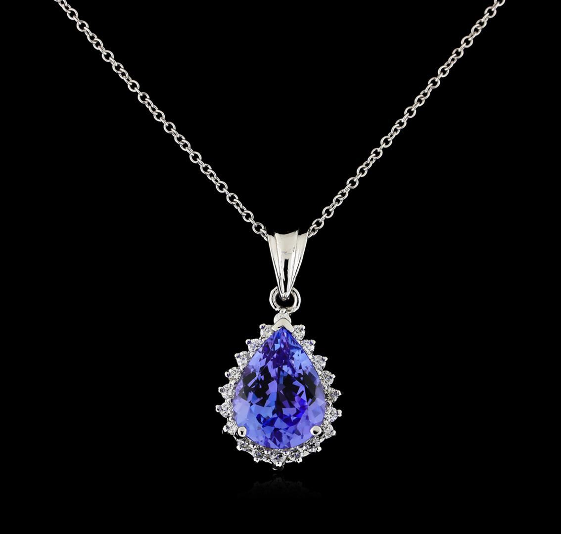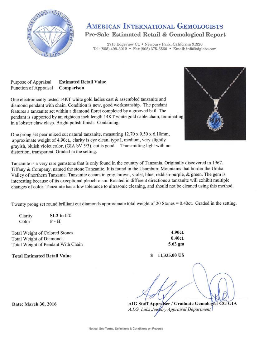 One electronically tested 14KT white gold ladies cast & assembled tanzanite and diamond pendant with chain. The pendant features a tanzanite set within a diamond floret completed by a grooved bail. The pendant is supported by an eighteen inch length 14KT white gold cable chain, terminating in a lobster claw clasp. Bright polish finish. Condition is new, good workmanship. Containing: One prong set pear mixed cut natural tanzanite, measuring 12.70 x 9.50 x 6.10mm, approximate weight of 4.90ct., clarity is eye clean, type I, medium, very slightly grayish, bluish violet color, (GIA bV 5/3), cut is good. Transmitting light with no distortion, transparent. Graded in the setting. Tanzanite is a very rare gemstone that is only found in the country of Tanzania. Originally discovered in 1967. Tiffany & Company, named the stone Tanzanite. It is found in the Usumburu Mountains that border the Umba Valley of northern Tanzania. Tanzanite occurs in gray, brown, violet, blue, reddish-purple, & green. The gem is interesting because of its exceptional pleochroism. Rotated in different directions a tanzanite will exhibit multiple changes of color. Tanzanite has a low tolerance to ultrasonic cleaning, and should not be cleaned using this method. Twenty prong set round brilliant cut diamonds approximate. Total Weight of 20 Stones = 0.40ct. Graded in the setting. Clarity: SI-2 to I-2. Color: F - H. Total Weight of Colored Stones 4.90ct. Total Weight of Diamonds 0.40ct. Total Weight of Pendant With Chain 5.63gm. AIG Appraised at $11,335.00.