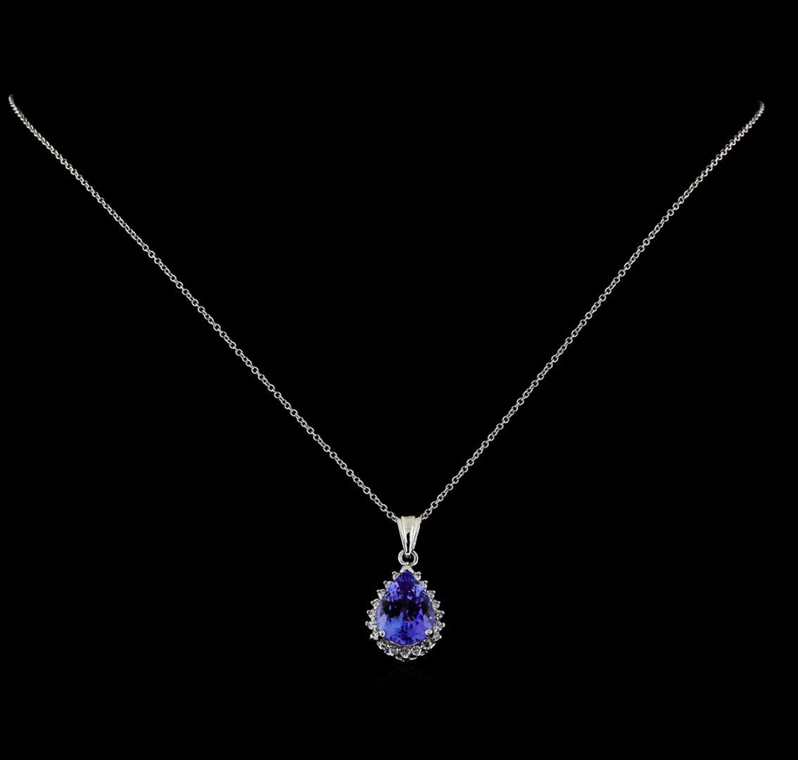 One electronically tested 14KT white gold ladies cast & assembled tanzanite and diamond pendant with chain. The pendant features a tanzanite set within a diamond floret completed by a grooved bail. The pendant is supported by an eighteen inch length 14KT white gold cable chain, terminating in a lobster claw clasp. Bright polish finish. Condition is new, good workmanship. Containing: One prong set pear mixed cut natural tanzanite, measuring 12.70 x 9.50 x 6.10mm, approximate weight of 4.90ct., clarity is eye clean, type I, medium, very slightly grayish, bluish violet color, (GIA bV 5/3), cut is good. Transmitting light with no distortion, transparent. Graded in the setting. Tanzanite is a very rare gemstone that is only found in the country of Tanzania. Originally discovered in 1967. Tiffany & Company, named the stone Tanzanite. It is found in the Usumburu Mountains that border the Umba Valley of northern Tanzania. Tanzanite occurs in gray, brown, violet, blue, reddish-purple, & green. The gem is interesting because of its exceptional pleochroism. Rotated in different directions a tanzanite will exhibit multiple changes of color. Tanzanite has a low tolerance to ultrasonic cleaning, and should not be cleaned using this method. Twenty prong set round brilliant cut diamonds approximate. Total Weight of 20 Stones = 0.40ct. Graded in the setting. Clarity: SI-2 to I-2. Color: F - H. Total Weight of Colored Stones 4.90ct. Total Weight of Diamonds 0.40ct. Total Weight of Pendant With Chain 5.63gm. AIG Appraised at $11,335.00.
