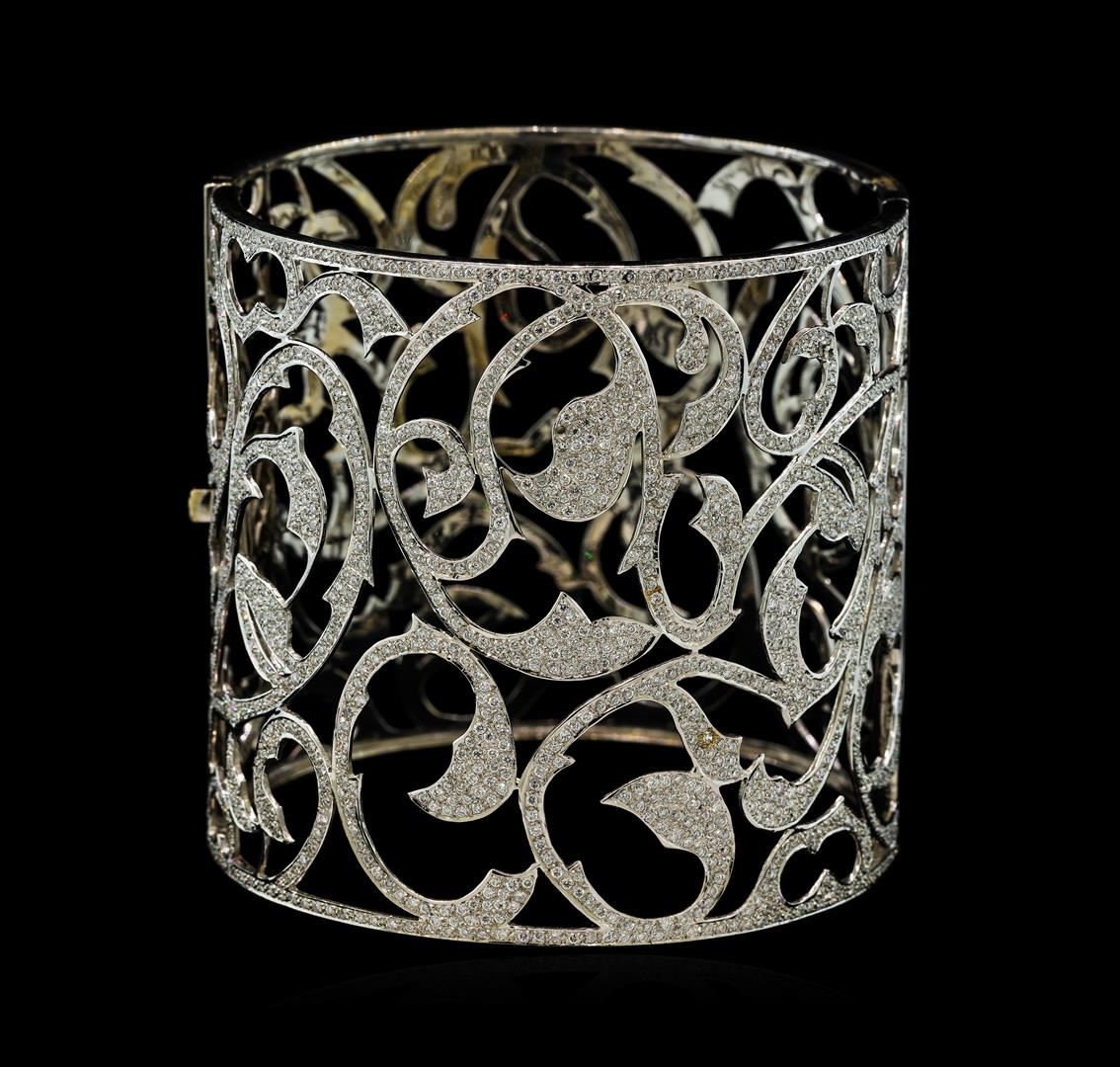 One electronically tested 18KT white gold ladies cast & assembled diamond cuff bracelet. The seven and one-half inch wearable length cuff bracelet features a two and one-half inch wide elaborate diamond set filligree with a hinged locking box style clasp. Bright polish finish. Identified with markings of '750'. Condition is good. Containing: One Thousand, One Hundred Seventy prong set round brilliant cut diamonds, measuring 1.10 - 1.00 x 0.63mm (depth est.) approximate total weight of 1170 Stones = 4.91ct. Graded in the setting. Clarity VS-1 to SI-1. Color: F - H. Total Weight of Diamonds 4.91ct.. Total Weight of Bracelet 75.04gm. AIG Appraised at $41,330.00.