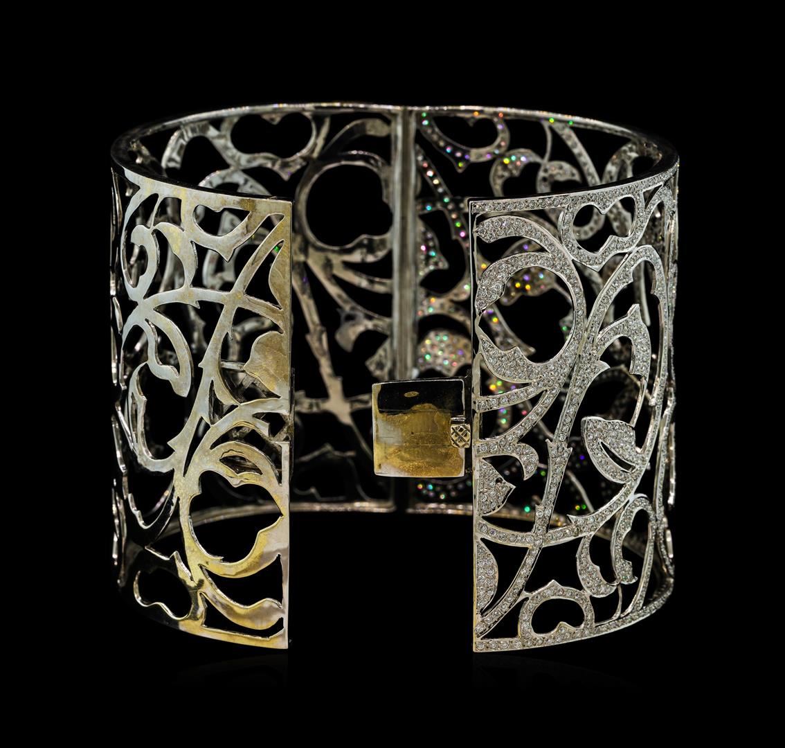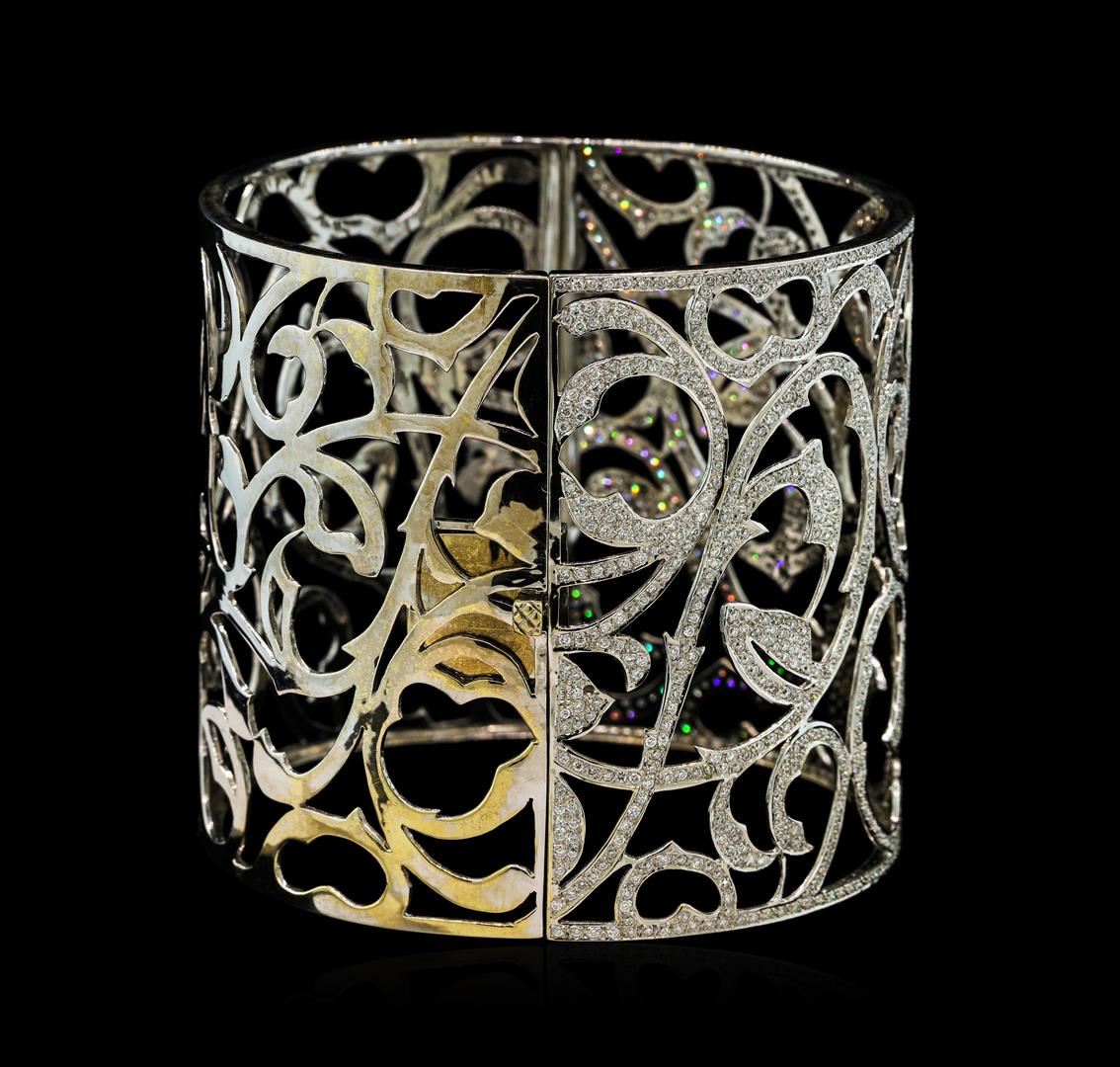 One electronically tested 18KT white gold ladies cast & assembled diamond cuff bracelet. The seven and one-half inch wearable length cuff bracelet features a two and one-half inch wide elaborate diamond set filligree with a hinged locking box style clasp. Bright polish finish. Identified with markings of '750'. Condition is good. Containing: One Thousand, One Hundred Seventy prong set round brilliant cut diamonds, measuring 1.10 - 1.00 x 0.63mm (depth est.) approximate total weight of 1170 Stones = 4.91ct. Graded in the setting. Clarity VS-1 to SI-1. Color: F - H. Total Weight of Diamonds 4.91ct.. Total Weight of Bracelet 75.04gm. AIG Appraised at $41,330.00.