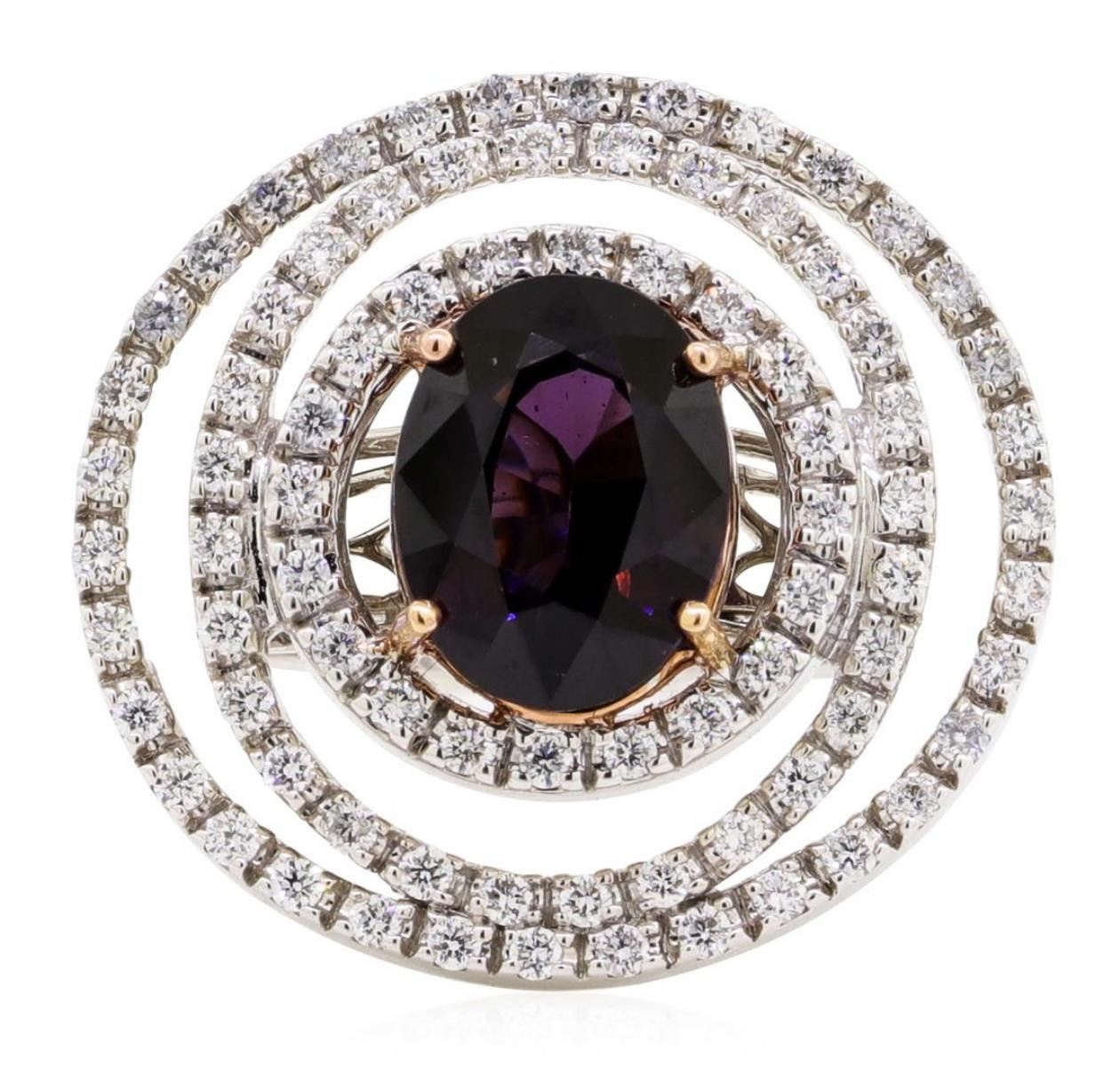 One electronically tested 18KT white and rose gold lady's combination cast & assembled fashion ring with a triple halo with a bright polish finish. The featured lady's ring has a shank measuring 2.40 millimeters wide. Identified with markings of '18K'. Condition is new, good workmanship. Containing: One prong set oval modified mixed cut natural lavender spinel, measuring 11.96 x 8.32 x 5.90mm, (depth est.) approximate weight of 4.09ct., clarity is eye clean, dark, moderately strong, purple color, (GIA P 7/4), cut is very good. Transmitting light with no distortion, transparent. Colored gemstones are presumed to have been subjected to commonly used enhancement processes. Graded in the setting. Eighty-Two prong set round brilliant cut diamonds, measuring 1.40 - 1.35 x 0.86mm (depth est.) approximate total weight of 82 Stones = 0.83ct. Graded in the setting. Color G - H Clarity VS-2 to SI-1 Cut Very Good. Total Weight of Colored Stones 4.09ct.. Total Weight of Diamonds 0.83ct.. Total Weight of Ring 12.50gm GAS Appraised at $7825.00. GAS Appraised.