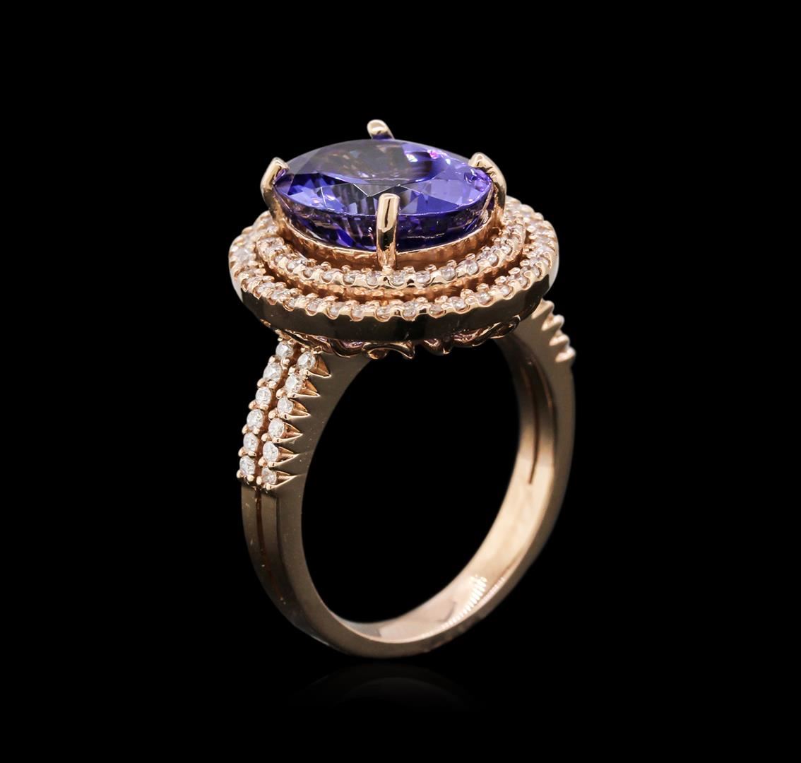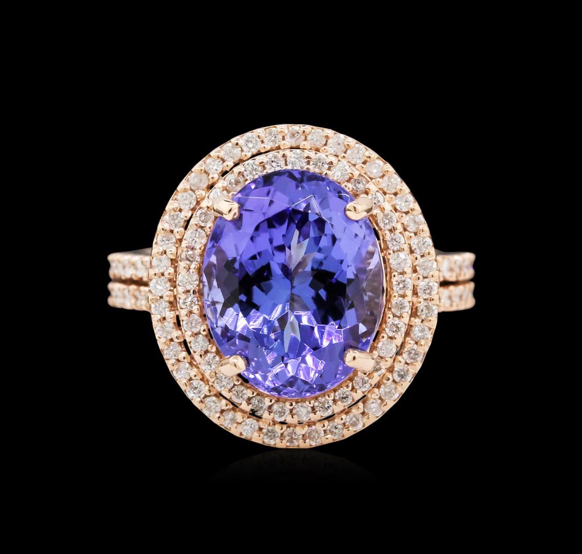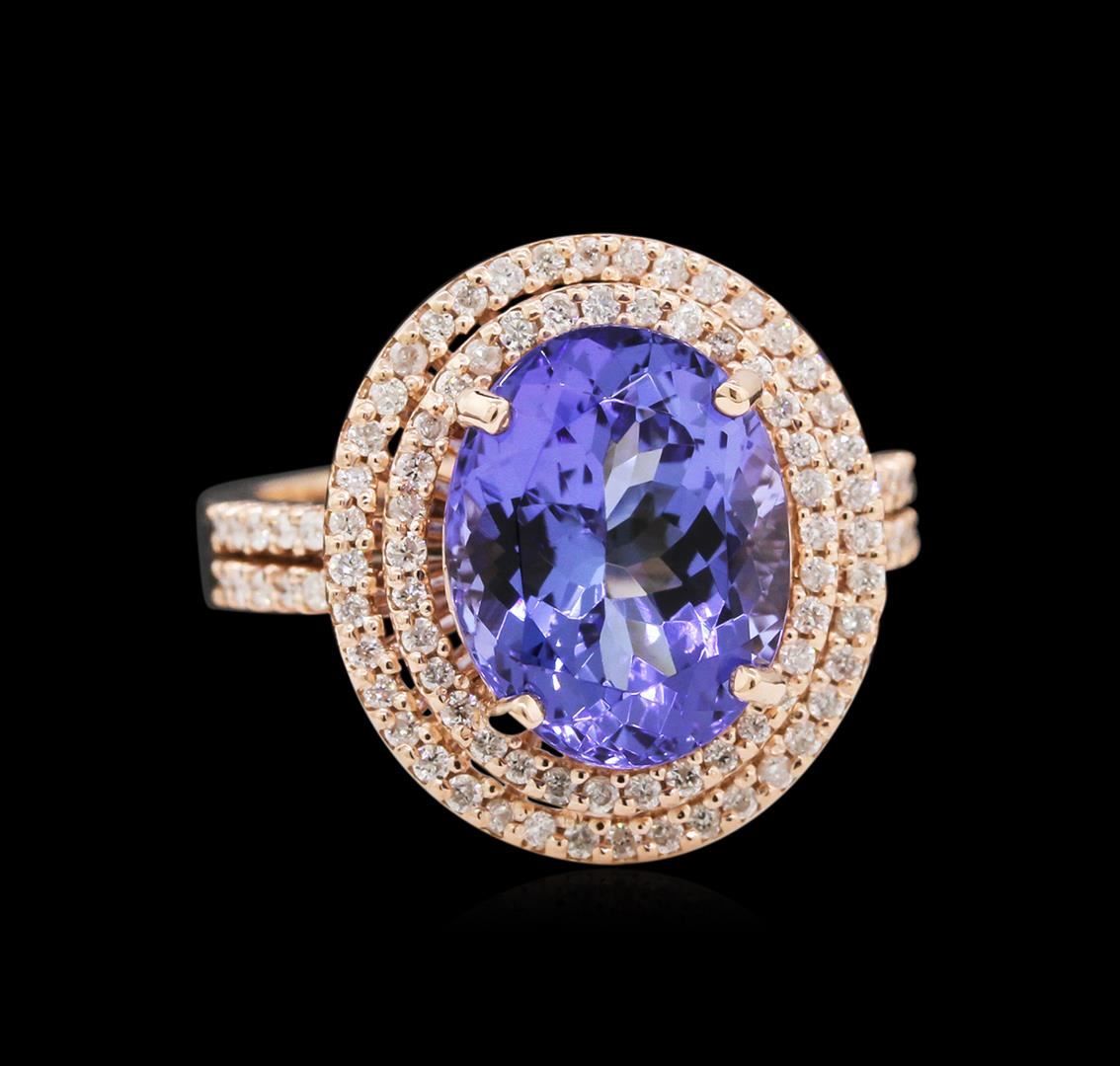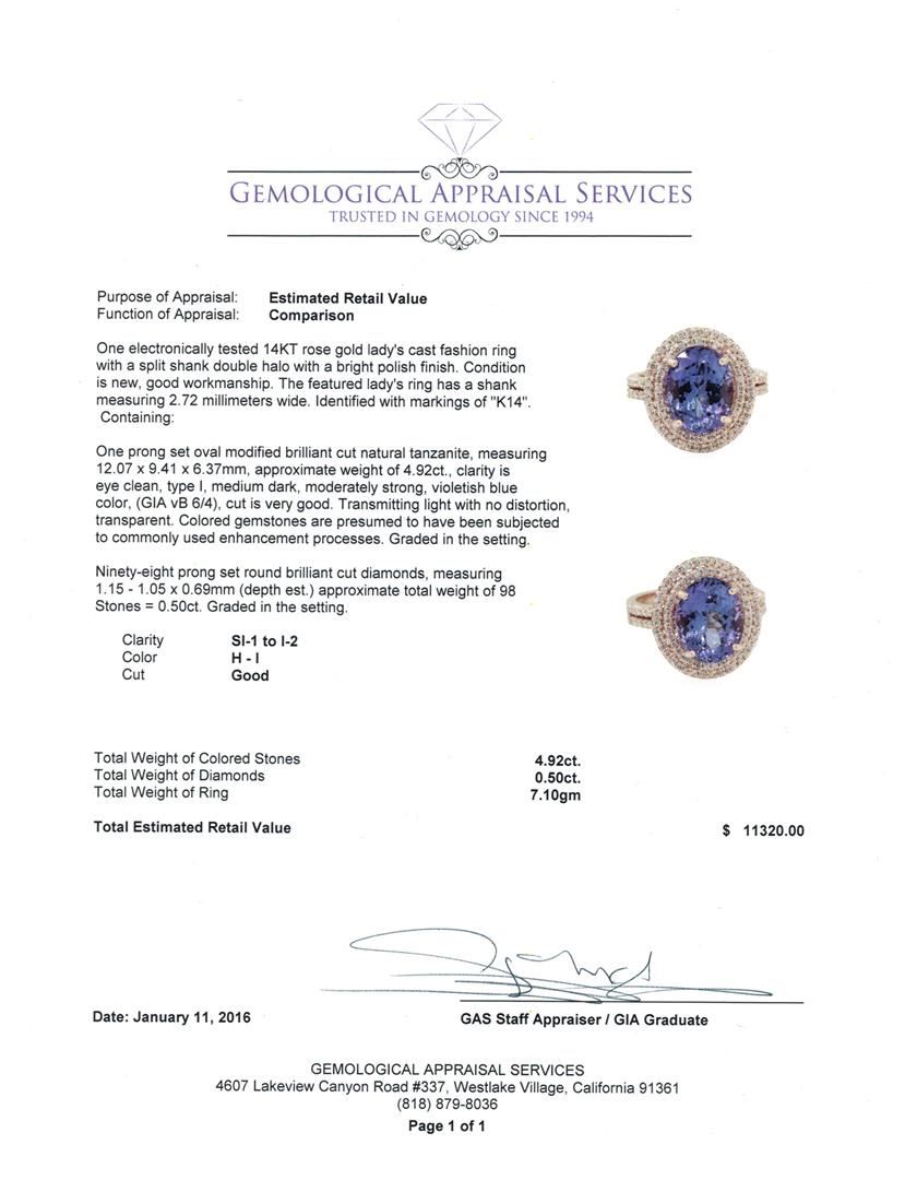 One electronically tested 14KT rose gold lady's cast fashion ring with a split shank double halo with a bright polish finish. The featured lady's ring has a shank measuring 2.72 millimeters wide. Identified with markings of "K14". Condition is new, good workmanship. Containing: One prong set oval modified brilliant cut natural tanzanite, measuring 12.07 x 9.41 x 6.37mm, approximate weight of 4.92ct., clarity is eye clean, type I, medium dark, moderately strong, violetish blue color, (GIA vB 6/4), cut is very good. Transmitting light with no distortion, transparent. Colored gemstones are presumed to have been subjected to commonly used enhancement processes. Graded in the setting. Ninety-Eight prong set round brilliant cut diamonds, measuring 1.15 - 1.05 x 0.69mm (depth est.) approximate total weight of 98 Stones = 0.50ct. Graded in the setting. Clarity: SI-1 to I-2. Color: H - I. Cut Good. Total Weight of Colored Stones 4.92ct. Total Weight of Diamonds 0.50ct. Total Weight of Ring 7.10gm. GAS Appraised at $11,320.00.
