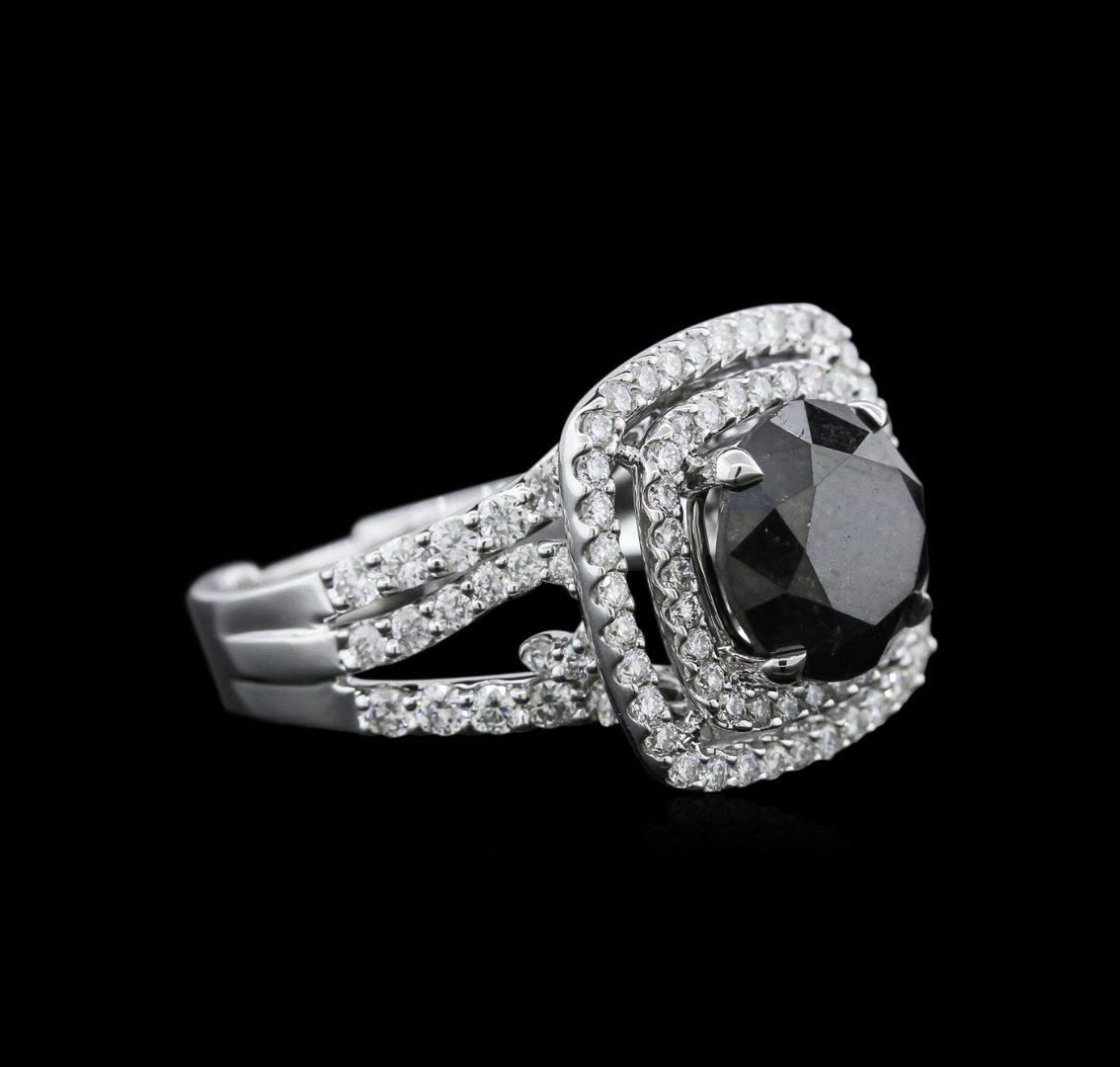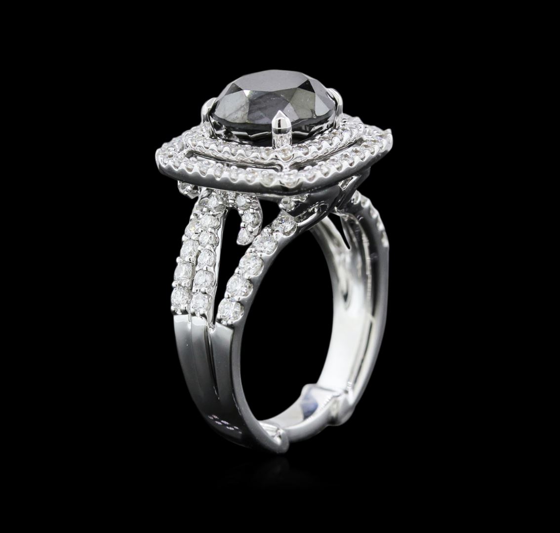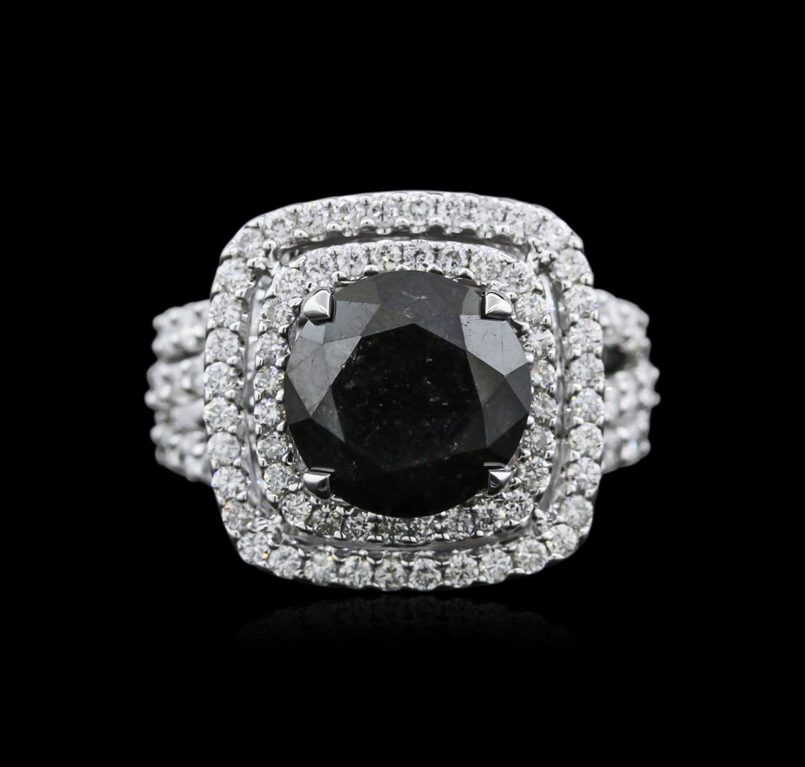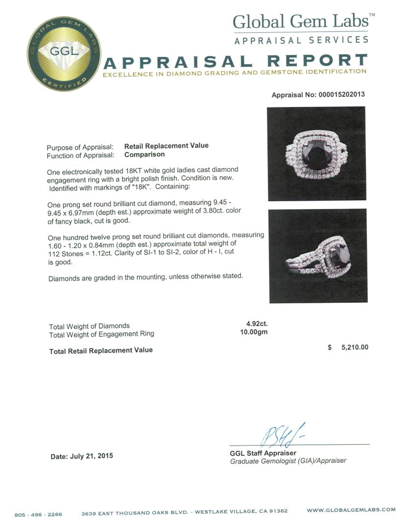 One electronically tested 18KT white gold ladies cast diamond engagement ring with a bright polish finish. Identified with markings of "18K". Condition is new. Containing: One prong set round brilliant cut diamond, measuring 9.45 - 9.45 x 6.97mm (depth est.) approximate weight of 3.80ct. color of fancy black, cut is Good. One Hundred Twelve prong set round brilliant cut diamonds, measuring 1.60 - 1.20 x 0.84mm (depth est.) approximate total weight of 112 Stones = 1.12ct. Clarity: SI-1 to SI-2. Color: H - I, Cut is Good. Diamonds are graded in the mounting, unless otherwise stated. Total Weight of Diamonds 4.92ct. Total Weight of Engagement Ring 10.00gm. GGL Appraised at $5,210.00.