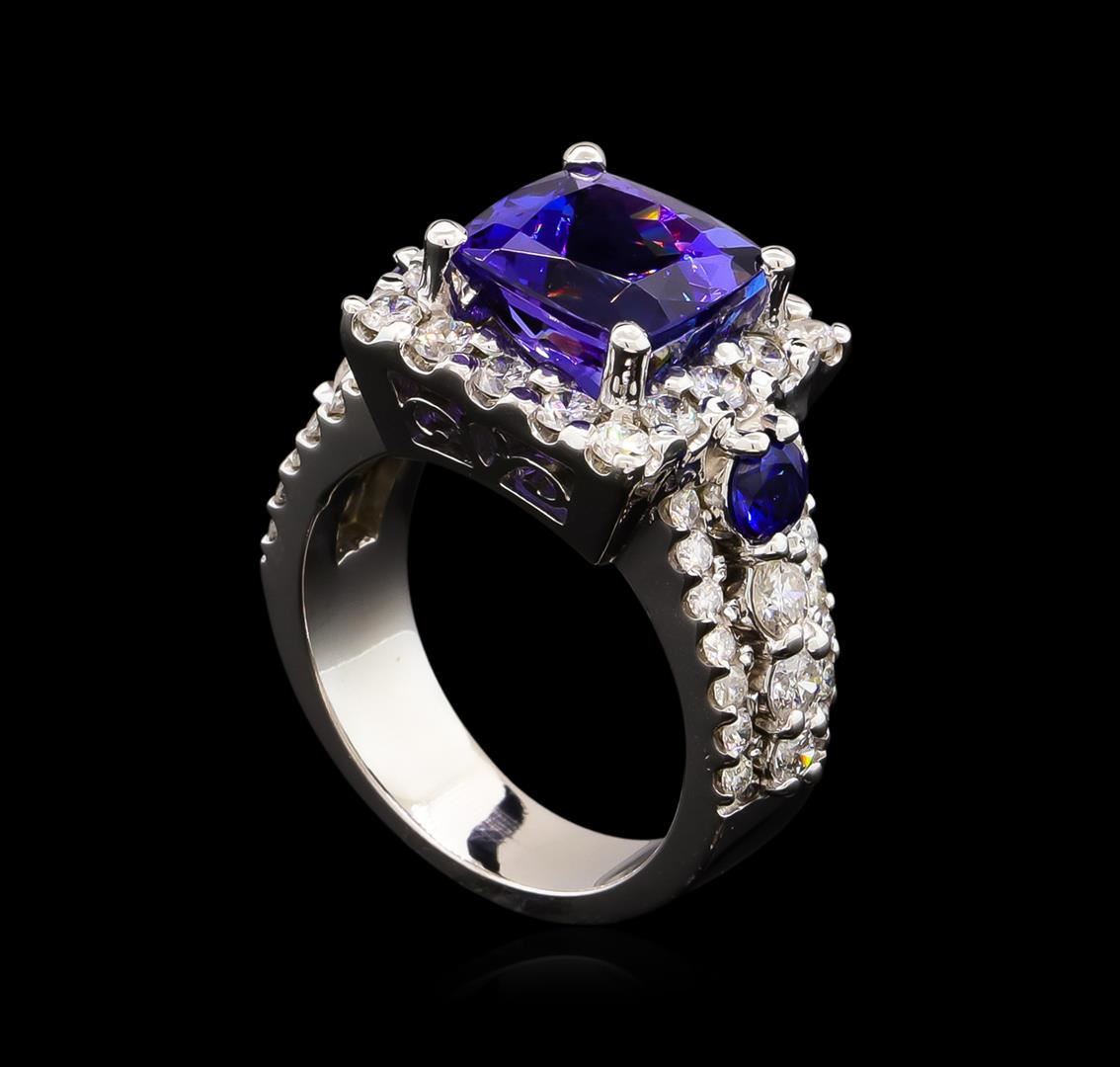 One electronically tested 14KT white gold lady's cast fashion ring with a three row halo with a bright polish finish. The featured lady's ring has a shank measuring 5.07 millimeters wide. Identified with markings of "14K". Condition is new, good workmanship. Containing: One prong set square cushion modified brilliant cut natural tanzanite, measuring 9.31 x 9.26 x 6.69mm, 8%. bulge factor, approximate weight of 4.94ct., clarity is eye clean, type I, medium dark, moderately strong, violetish blue color, (GIA vB 6/4), cut is very good. Transmitting light with no distortion, transparent. Colored gemstones are presumed to have been subjected to commonly used enhancement processes. Graded in the setting. Two prong set round modified brilliant cut natural blue sapphires, measuring 3.70 - 3.68 x 2.40 mm, approximate total weight of 0.50ct., clarity is eye clean, type II, medium dark, strong, blue color, (GIA B 6/5), cut is very good. Transmitting light with no distortion, transparent. Colored gemstones are presumed to have been subjected to commonly used enhancement processes. Graded in the setting. Two prong set round brilliant cut diamonds, measuring 3.10 - 3.05 x 1.91mm (depth est.) approximate total weight of 2 Stones = 0.22ct. Graded in the setting. Clarity: I-1. Color: H - I. Cut Good Four prong set round brilliant cut diamonds, measuring 2.70 - 2.50 x 1.56mm (depth est.) approximate total weight of 4 Stones = 0.25ct. Graded in the setting. Clarity: SI-1 to SI-2. Color: H - I. Cut Good Sixteen prong set round brilliant cut diamonds, measuring 2.30 - 2.20 x 1.40mm (depth est.) approximate total weight of 16 Stones = 0.70ct. Graded in the setting. Clarity: SI-1 to I-1. Color: H - I. Cut Good Twenty-Eight prong set round brilliant cut diamonds, measuring 1.60 - 1.50 x 0.96mm (depth est.) approximate total weight of 28 Stones = 0.40ct. Graded in the setting. Clarity: SI-1 to I-1. Color: H - I. Cut Good. Total Weight of Colored Stones 5.44ct. Total Weight of Diamonds 1.57ct. Total Weight of Ring 12.20gm. GAS Appraised at $14,120.00.