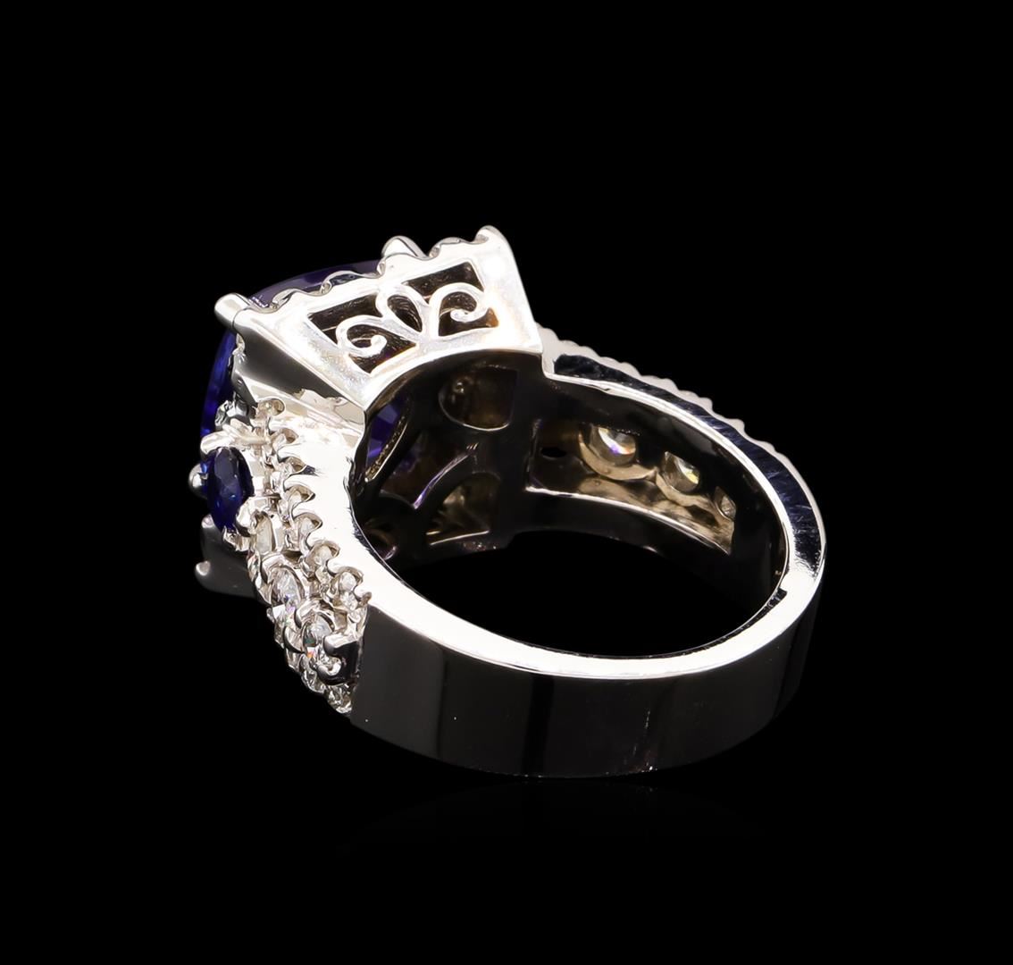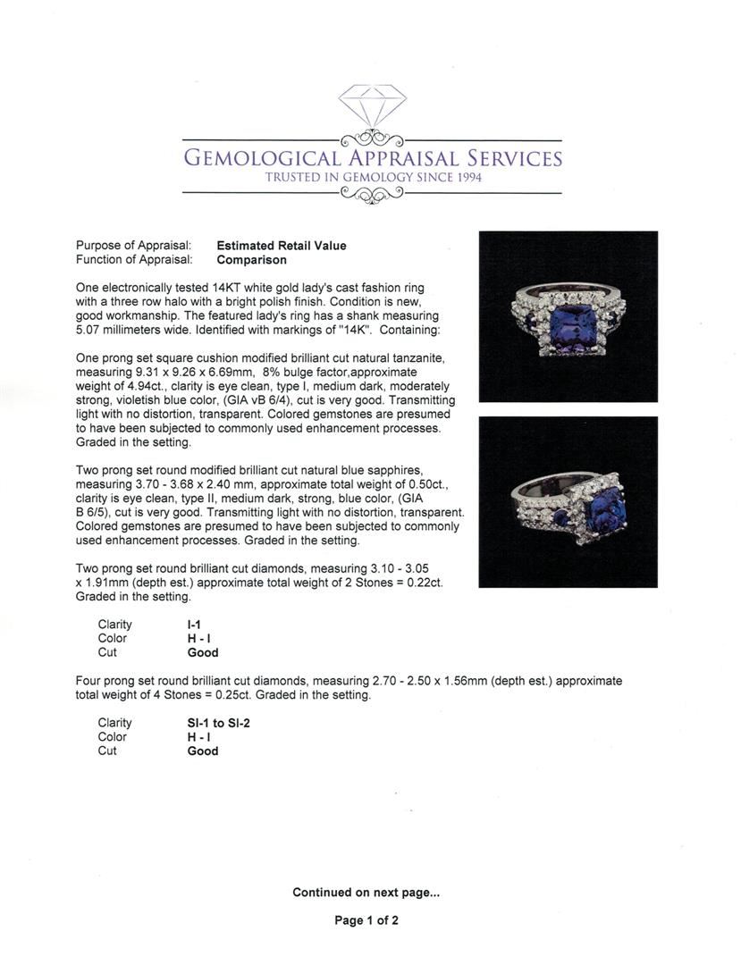 One electronically tested 14KT white gold lady's cast fashion ring with a three row halo with a bright polish finish. The featured lady's ring has a shank measuring 5.07 millimeters wide. Identified with markings of "14K". Condition is new, good workmanship. Containing: One prong set square cushion modified brilliant cut natural tanzanite, measuring 9.31 x 9.26 x 6.69mm, 8%. bulge factor, approximate weight of 4.94ct., clarity is eye clean, type I, medium dark, moderately strong, violetish blue color, (GIA vB 6/4), cut is very good. Transmitting light with no distortion, transparent. Colored gemstones are presumed to have been subjected to commonly used enhancement processes. Graded in the setting. Two prong set round modified brilliant cut natural blue sapphires, measuring 3.70 - 3.68 x 2.40 mm, approximate total weight of 0.50ct., clarity is eye clean, type II, medium dark, strong, blue color, (GIA B 6/5), cut is very good. Transmitting light with no distortion, transparent. Colored gemstones are presumed to have been subjected to commonly used enhancement processes. Graded in the setting. Two prong set round brilliant cut diamonds, measuring 3.10 - 3.05 x 1.91mm (depth est.) approximate total weight of 2 Stones = 0.22ct. Graded in the setting. Clarity: I-1. Color: H - I. Cut Good Four prong set round brilliant cut diamonds, measuring 2.70 - 2.50 x 1.56mm (depth est.) approximate total weight of 4 Stones = 0.25ct. Graded in the setting. Clarity: SI-1 to SI-2. Color: H - I. Cut Good Sixteen prong set round brilliant cut diamonds, measuring 2.30 - 2.20 x 1.40mm (depth est.) approximate total weight of 16 Stones = 0.70ct. Graded in the setting. Clarity: SI-1 to I-1. Color: H - I. Cut Good Twenty-Eight prong set round brilliant cut diamonds, measuring 1.60 - 1.50 x 0.96mm (depth est.) approximate total weight of 28 Stones = 0.40ct. Graded in the setting. Clarity: SI-1 to I-1. Color: H - I. Cut Good. Total Weight of Colored Stones 5.44ct. Total Weight of Diamonds 1.57ct. Total Weight of Ring 12.20gm. GAS Appraised at $14,120.00.