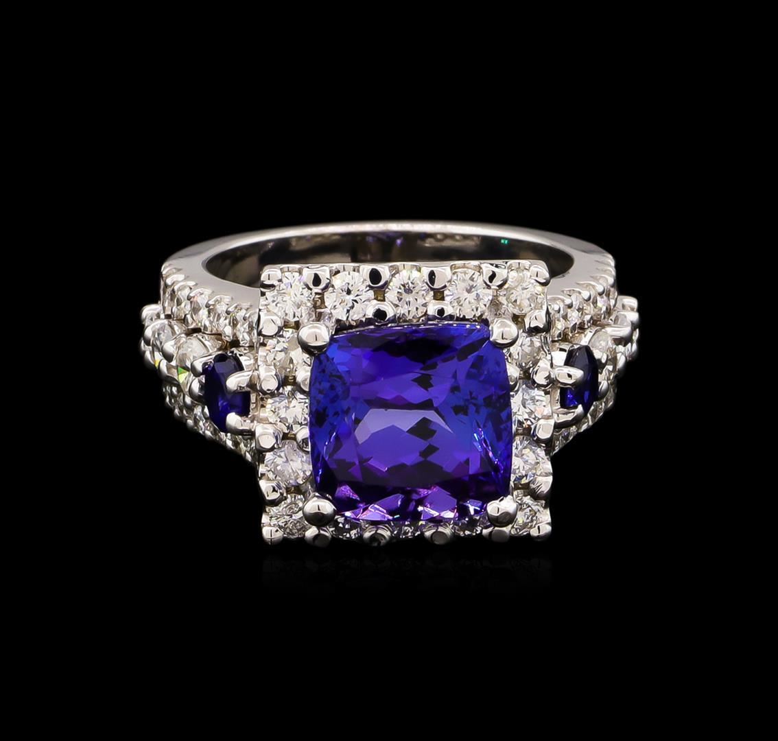 One electronically tested 14KT white gold lady's cast fashion ring with a three row halo with a bright polish finish. The featured lady's ring has a shank measuring 5.07 millimeters wide. Identified with markings of "14K". Condition is new, good workmanship. Containing: One prong set square cushion modified brilliant cut natural tanzanite, measuring 9.31 x 9.26 x 6.69mm, 8%. bulge factor, approximate weight of 4.94ct., clarity is eye clean, type I, medium dark, moderately strong, violetish blue color, (GIA vB 6/4), cut is very good. Transmitting light with no distortion, transparent. Colored gemstones are presumed to have been subjected to commonly used enhancement processes. Graded in the setting. Two prong set round modified brilliant cut natural blue sapphires, measuring 3.70 - 3.68 x 2.40 mm, approximate total weight of 0.50ct., clarity is eye clean, type II, medium dark, strong, blue color, (GIA B 6/5), cut is very good. Transmitting light with no distortion, transparent. Colored gemstones are presumed to have been subjected to commonly used enhancement processes. Graded in the setting. Two prong set round brilliant cut diamonds, measuring 3.10 - 3.05 x 1.91mm (depth est.) approximate total weight of 2 Stones = 0.22ct. Graded in the setting. Clarity: I-1. Color: H - I. Cut Good Four prong set round brilliant cut diamonds, measuring 2.70 - 2.50 x 1.56mm (depth est.) approximate total weight of 4 Stones = 0.25ct. Graded in the setting. Clarity: SI-1 to SI-2. Color: H - I. Cut Good Sixteen prong set round brilliant cut diamonds, measuring 2.30 - 2.20 x 1.40mm (depth est.) approximate total weight of 16 Stones = 0.70ct. Graded in the setting. Clarity: SI-1 to I-1. Color: H - I. Cut Good Twenty-Eight prong set round brilliant cut diamonds, measuring 1.60 - 1.50 x 0.96mm (depth est.) approximate total weight of 28 Stones = 0.40ct. Graded in the setting. Clarity: SI-1 to I-1. Color: H - I. Cut Good. Total Weight of Colored Stones 5.44ct. Total Weight of Diamonds 1.57ct. Total Weight of Ring 12.20gm. GAS Appraised.