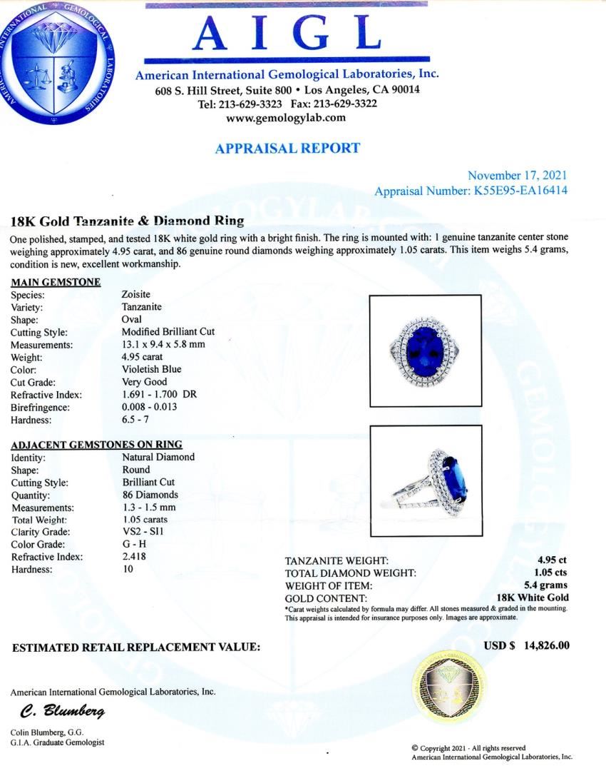 One polished, stamped, and tested 18K white gold ring with a bright finish. The ring is mounted with: 1 genuine tanzanite center stone weighing approximately 4.95 carat, and 86 genuine round diamonds weighing approximately 1.05 carats. This item weighs 5.4 grams, condition is new, excellent workmanship. MAIN GEMSTONE Species: Zoisite Variety: Tanzanite Shape: Oval Cutting Style: Modified Brilliant Cut Measurements: 13.1 x 9.4 x 5.8mm Weight: 4.95 carat Color: Violetish Blue Cut Grade: Very Good Refractive Index: 1.691 - 1.700 DR Birefringence: 0.008 - 0.013 Hardness: 6.5 - 7 ADJACENT GEMSTONES ON RING Identity: Natural Diamond Shape: Round Cutting Style: Brilliant Cut Quantity: 86 Diamonds Measurements: 1.3 - 1.5mm Total Weight: 1.05 carats Clarity Grade: VS2 to SI1 Color Grade: G - H Refractive Index: 2.418 Hardness: 10 TANZANITE WEIGHT: 4.95ct TOTAL DIAMOND WEIGHT: 1.05ctw WEIGHT OF ITEM: 5.4 grams GOLD CONTENT: 18K White Gold #LREF-5595
