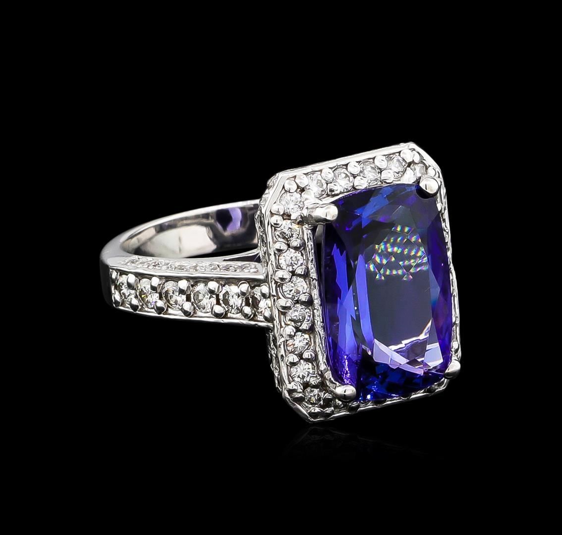 One electronically tested 14KT white gold lady's cast fashion ring with a cathedral shank with a halo with a bright polish finish. The featured lady's ring has a shank measuring 3.04 millimeters wide. Identified with markings of "K14". Condition is new, good workmanship. Containing: One prong set rectangular cushion modified brilliant cut natural tanzanite, measuring 13.05 x 8.93 x 5.22mm, approximate weight of 4.95ct., clarity is slightly included, type I, medium dark, moderately strong, violetish blue color, (GIA vB 6/4), cut is very good. Transmitting light with a minimum of distortion, transparent. Colored gemstones are presumed to have been subjected to commonly used enhancement processes. Graded in the setting. Twelve prong set round brilliant cut diamonds, measuring 2.00 - 1.90 x 1.17mm (depth est.) approximate total weight of 12 Stones = 0.31ct. Graded in the setting. Clarity: VS-2 to SI-1. Color: H - I. Cut Good Twenty-Four prong set round brilliant cut diamonds, measuring 1.60 - 1.50 x 0.93mm (depth est.) approximate total weight of 24 Stones = 0.33ct. Graded in the setting. Clarity: SI-1 to SI-2. Color: H - I. Cut Good Ninety-Two prong set round brilliant cut diamonds, measuring 1.15 - 1.10 x 0.69mm (depth est.) approximate total weight of 92 Stones = 0.49ct. Graded in the setting. Clarity: SI-1 to I-1. Color: H - I. Cut Good. Total Weight of Colored Stones 4.95ct. Total Weight of Diamonds 1.13ct. Total Weight of Ring 7.50gm. GAS Appraised at $12,820.00.