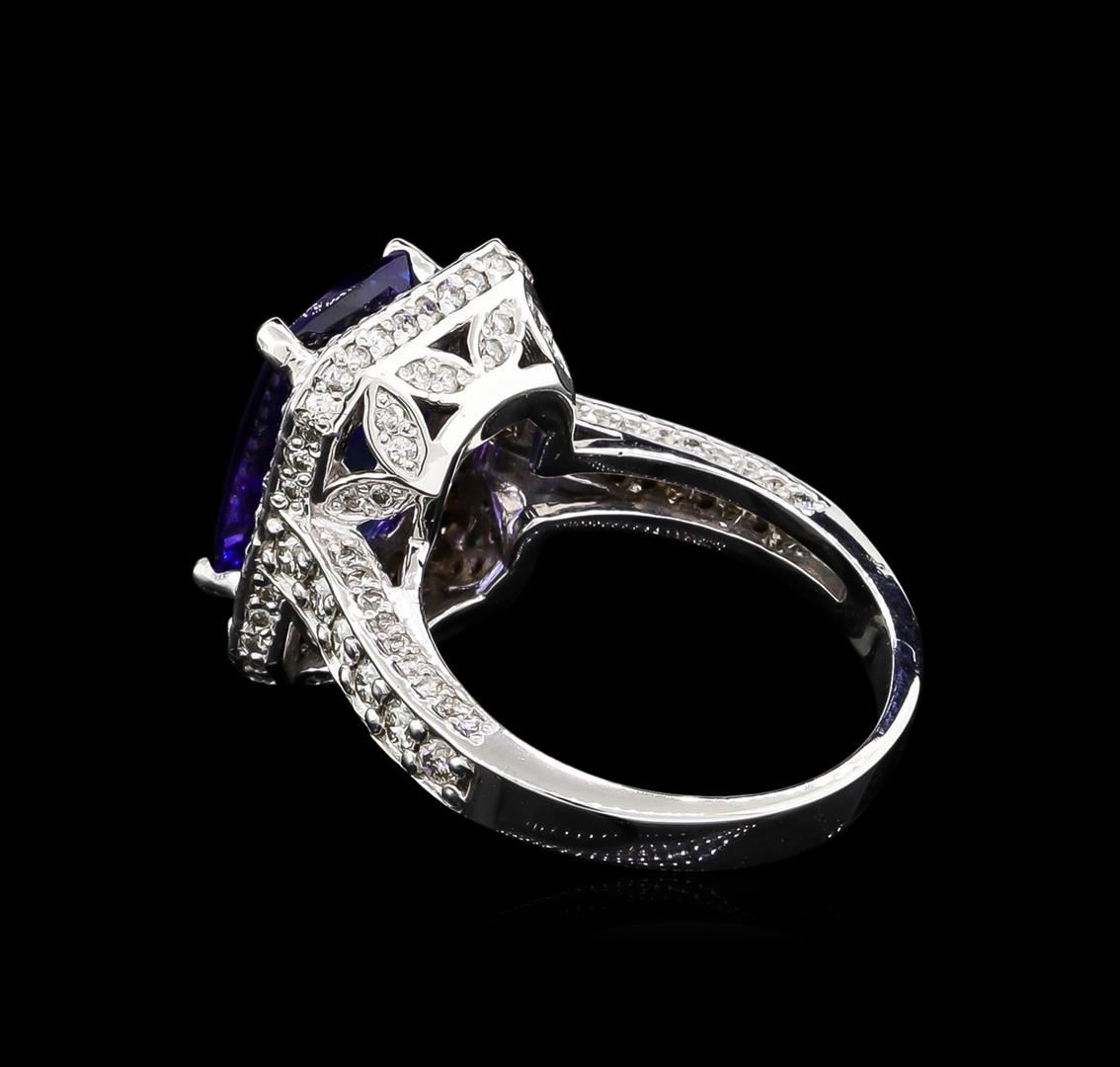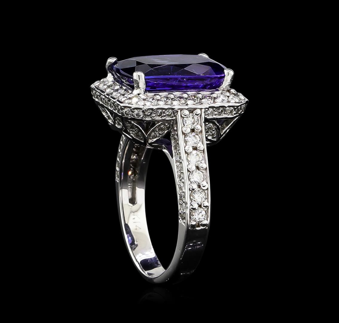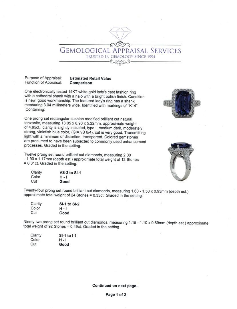 One electronically tested 14KT white gold lady's cast fashion ring with a cathedral shank with a halo with a bright polish finish. The featured lady's ring has a shank measuring 3.04 millimeters wide. Identified with markings of "K14". Condition is new, good workmanship. Containing: One prong set rectangular cushion modified brilliant cut natural tanzanite, measuring 13.05 x 8.93 x 5.22mm, approximate weight of 4.95ct., clarity is slightly included, type I, medium dark, moderately strong, violetish blue color, (GIA vB 6/4), cut is very good. Transmitting light with a minimum of distortion, transparent. Colored gemstones are presumed to have been subjected to commonly used enhancement processes. Graded in the setting. Twelve prong set round brilliant cut diamonds, measuring 2.00 - 1.90 x 1.17mm (depth est.) approximate total weight of 12 Stones = 0.31ct. Graded in the setting. Clarity: VS-2 to SI-1. Color: H - I. Cut Good Twenty-Four prong set round brilliant cut diamonds, measuring 1.60 - 1.50 x 0.93mm (depth est.) approximate total weight of 24 Stones = 0.33ct. Graded in the setting. Clarity: SI-1 to SI-2. Color: H - I. Cut Good Ninety-Two prong set round brilliant cut diamonds, measuring 1.15 - 1.10 x 0.69mm (depth est.) approximate total weight of 92 Stones = 0.49ct. Graded in the setting. Clarity: SI-1 to I-1. Color: H - I. Cut Good. Total Weight of Colored Stones 4.95ct. Total Weight of Diamonds 1.13ct. Total Weight of Ring 7.50gm. GAS Appraised at $12,820.00.
