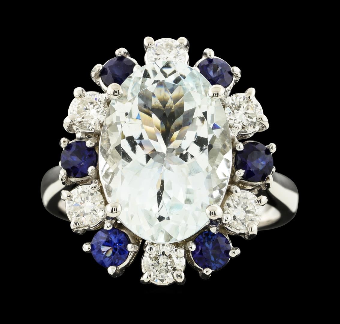 One ring : 14KT white gold weighing 5.90gm containing aquamarine with a total weight of 4.96ct, sapphire weighing 0.80ctw and diamonds weighing 0.60ctw.