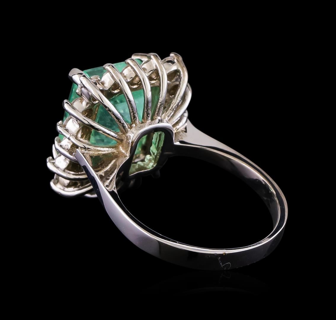 One electronically tested 14KT white gold lady's cast fashion ring with a basket halo with a bright polish finish. The featured lady's has a shank measuring 2.39 millimeters in width. Identified with markings of "14K". Condition is new, good workmanship. Containing: One prong set emerald step cut natural emerald, measuring 10.62 x 8.82 x 7.57mm, (depth est.) approximate weight of 4.96ct., clarity is moderately included, medium light, moderately strong, green color, (GIA G 4/4), cut is good. Transmitting light somewhat diffusely, transparent to translucent. Indications of oil residue. Naturally occurring internal & external characteristics are present. Colored gemstones are presumed to have been subjected to commonly used enhancement processes. Graded in the setting. Eighteen prong set round brilliant cut diamonds, measuring 2.10 - 2.00 x 1.27mm (depth est.) approximate total weight of 18 Stones = 0.60ct. Graded in the setting. Clarity: SI-1 to I-1. Color: I - J. Cut Good. Total Weight of Colored Stones 4.96ct. Total Weight of Diamonds 0.60ct. Total Weight of Ring 6.20gm. GAS Appraised.
