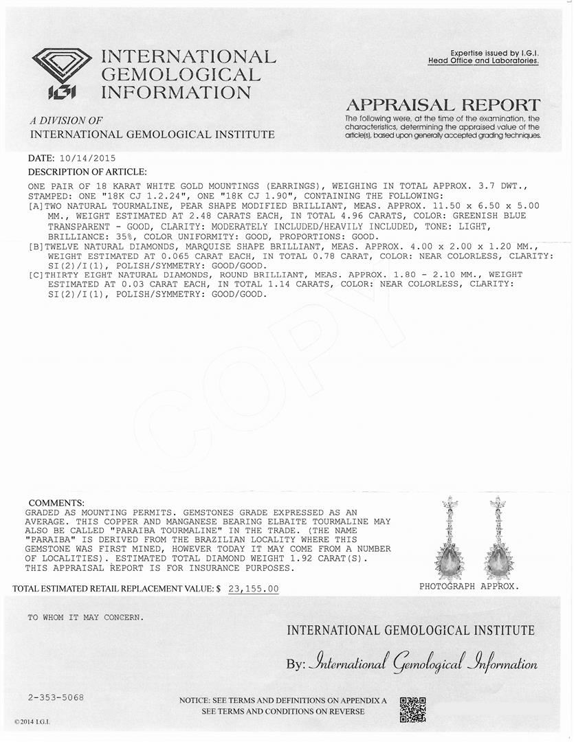 One pair of 18KT white gold earrings, weighing in total approx. 3.7 dwt., stamped: one "18K CJ 1.2.24", and "18K CJ 1.90", containing the following: Two natural tourmaline, pear shape modified brilliant, measuring approx. 11.50 x 6.50 x 5.00 mm, weight estimated at 2.48ct each, in total 4.96ct, color: greenish blue transparent - good, clarity: moderately included/heavily included, tone: light, brilliance: 35%, color uniformity: good, proportions: good. Twelve natural diamonds, marquise shape brilliant, measuring approx. 4.00 x 2.00 x 1.20 mm, weight estimated at 0.065ct each, in total 0.78ct, color: near colorless, clarity: SI2/I1, polish/symmetry: good/good. Thirty eight natural diamonds, round brilliant, measuring approx. 1.80 - 2.10 mm, weight estimated at 0.03ct each, in total 1.14ct, color: near colorless, clarity: SI2/I1, polish/symmetry: good/good. IGI Appraised at $23,155.00.