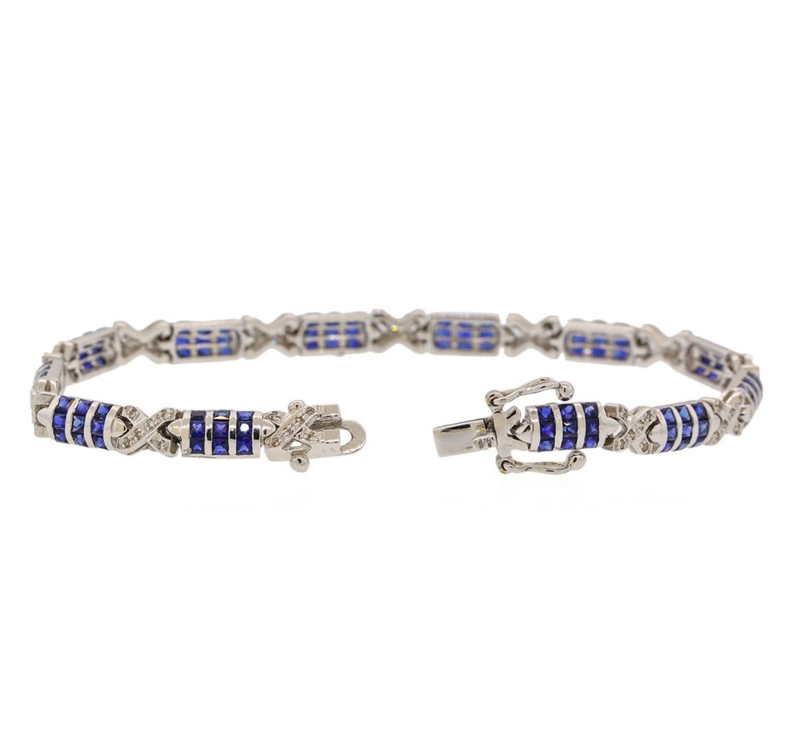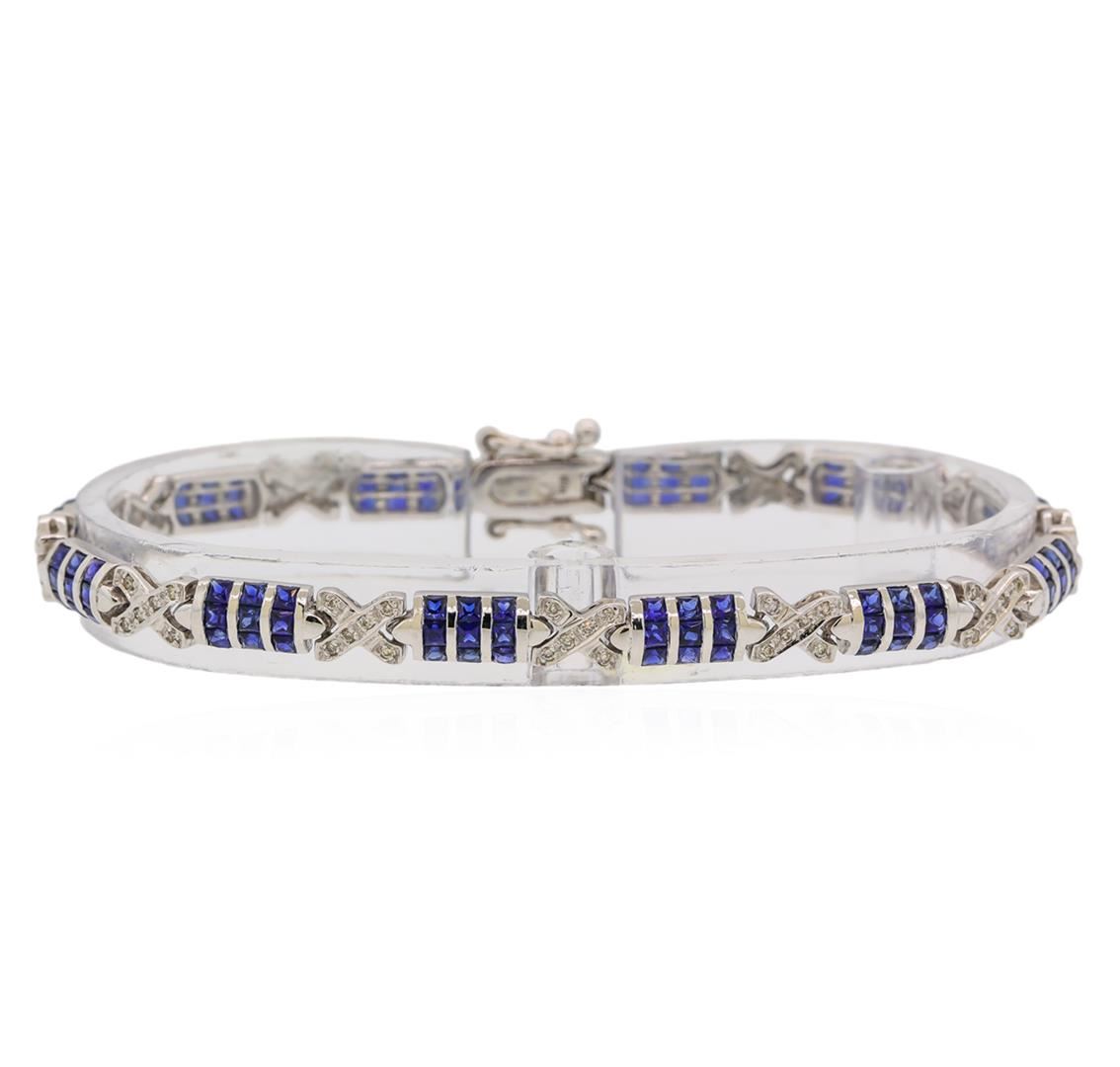 One electronically tested 18KT white gold lady's combination cast & assembled fashion bracelet with a tongue clasp with foldover safety with a bright polish finish. The featured lady's bracelet measures 7.5 inches in length. Identified with markings of '18K'. Condition is new, good workmanship. Containing: One hundred eight channel set princess modified brilliant cut natural blue sapphires, measuring 2.00 x 1.90 x 1.24mm, (depth est.) approximate total weight of 4.96ct., clarity is eye clean, medium, moderately strong, blue color, (GIA B 5/4), cut is very good. Transmitting light with no distortion, transparent. Colored gemstones are presumed to have been subjected to commonly used enhancement processes. Graded in the setting. Seventy-Two prong set round brilliant cut diamonds, measuring 1.10 - 1.05 x 0.67mm (depth est.) approximate total weight of 72 Stones = 0.35ct. Graded in the setting. Clarity SI-1 to SI-2. Color: H - I Cut Good. Total Weight of Colored Stones 4.96ct.. Total Weight of Diamonds 0.35ct.. Total Weight of Bracelet 16.90gm. GAS Appraised at $9,995.00.