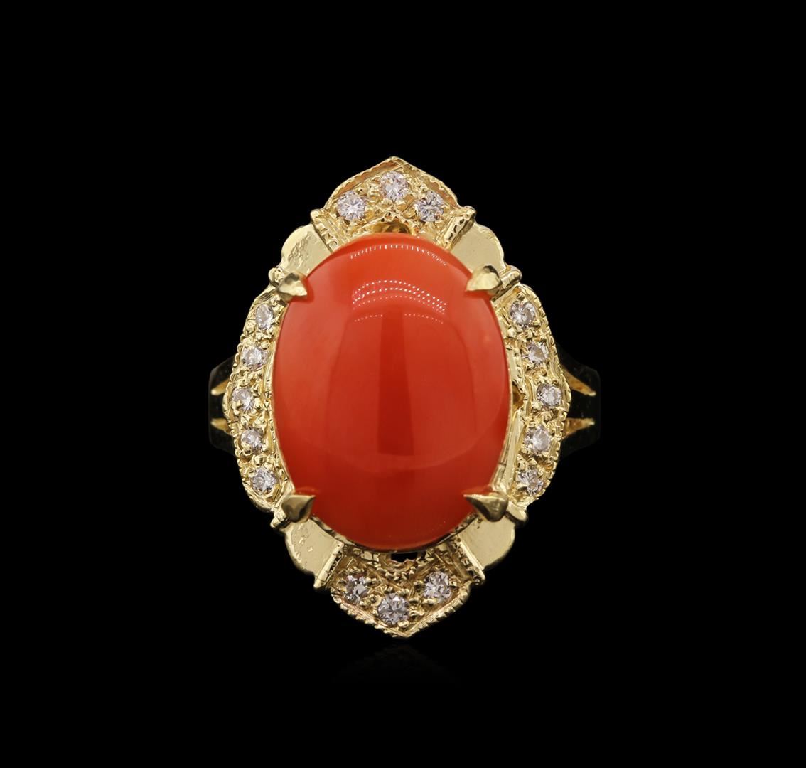 One ring featuring: 14KT yellow gold weighing 6.88 grams containing one coral center stone with a total weight of 4.97ct and 16 diamonds with a total weight of 0.22ct.