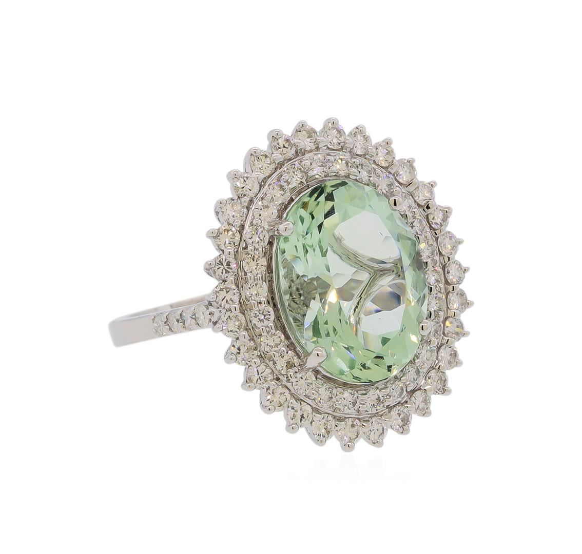 One electronically tested 14KT white gold lady's cast fashion ring with a double basket halo with a bright polish finish. The featured lady's ring has a shank measuring 1.93 millimeters wide. Identified with markings of '14K'. Condition is new, good workmanship. Containing: One prong set oval modified brilliant cut natural aquamarine, measuring 13.46 x 10.45 x 6.69mm, (depth est.) approximate weight of 4.98ct., clarity is eye clean, medium light, moderately strong, very strongly greenish blue color, (GIA vstgB 4/4), cut is very good. Transmitting light with no distortion, transparent. Colored gemstones are presumed to have been subjected to commonly used enhancement processes. Graded in the setting. Thirty prong set round brilliant cut diamonds, measuring 1.90 - 1.80 x 1.15mm (depth est.) approximate total weight of 30 Stones = 0.76ct. Graded in the setting. Clarity SI-1 to SI-2. Color: H - I Cut Good Thirty-Four prong set round brilliant cut diamonds, measuring 1.60 - 1.50 x 0.96mm (depth est.) approximate total weight of 34 Stones = 0.48ct. Graded in the setting. Clarity SI-1 to SI-2. Color: H - I Cut Good. Total Weight of Colored Stones 4.98ct.. Total Weight of Diamonds 1.24ct.. Total Weight of Ring 6.00gm. GAS Appraised at $13,790.00.